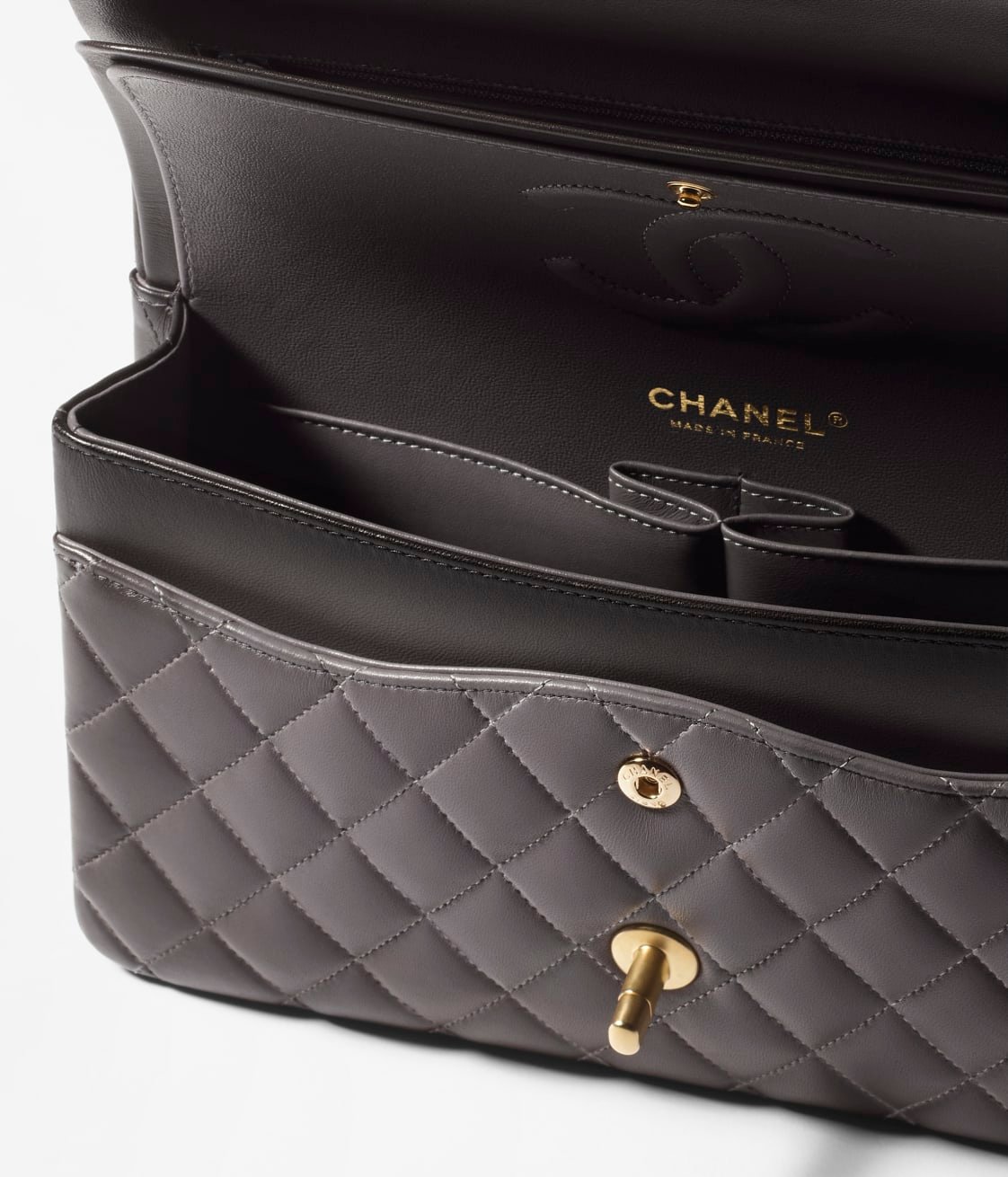 The interior is lined with dark grey leather and has a zip pocket with logo zipper on the back wall and an open pocket on the back wall below the zip pocket.