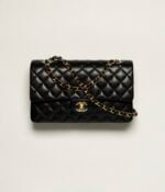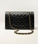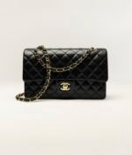 This flap bag is crafted in black lambskin and light gold hardware, with the signature CC turnlock closure on the front flap, a half-moon pocket on the back, and a single interwoven black leather and light gold chain link shoulder/crossbody strap.