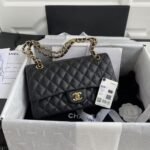This medium classic double flap bag is crafted in black caviar leather with gold hardware, featuring the signature CC turnlock closure on the front flap, half-moon back pocket, adjustable interwoven gold chain and black leather shoulder strap.