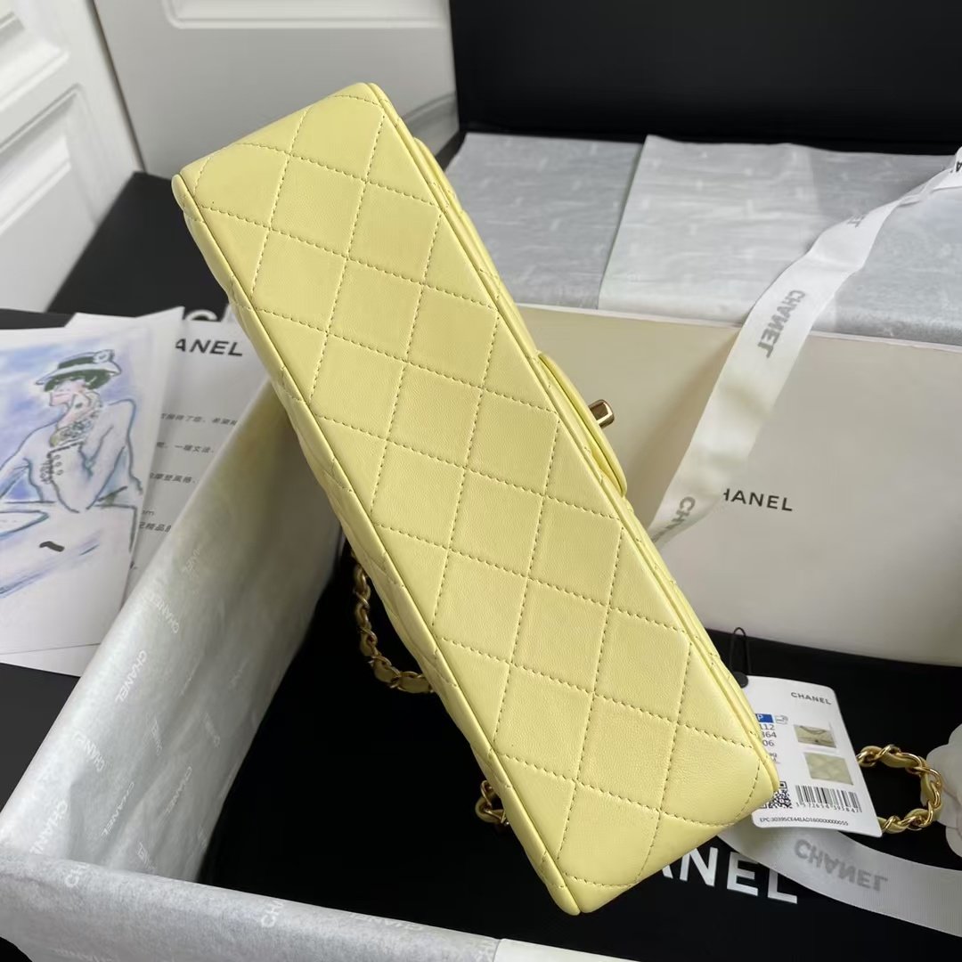 This medium classic double flap bag in yellow lambskin with gold hardware features the signature CC turnlock closure on the front flap, half-moon back pocket, adjustable gold interwoven chain and yellow leather shoulder strap.