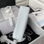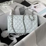 This medium classic double flap bag is crafted in light blue suede leather with silver hardware, featuring the signature CC turnlock closure on the front flap, half-moon back pocket, adjustable interwoven silver chain and light blue leather shoulder strap.