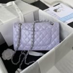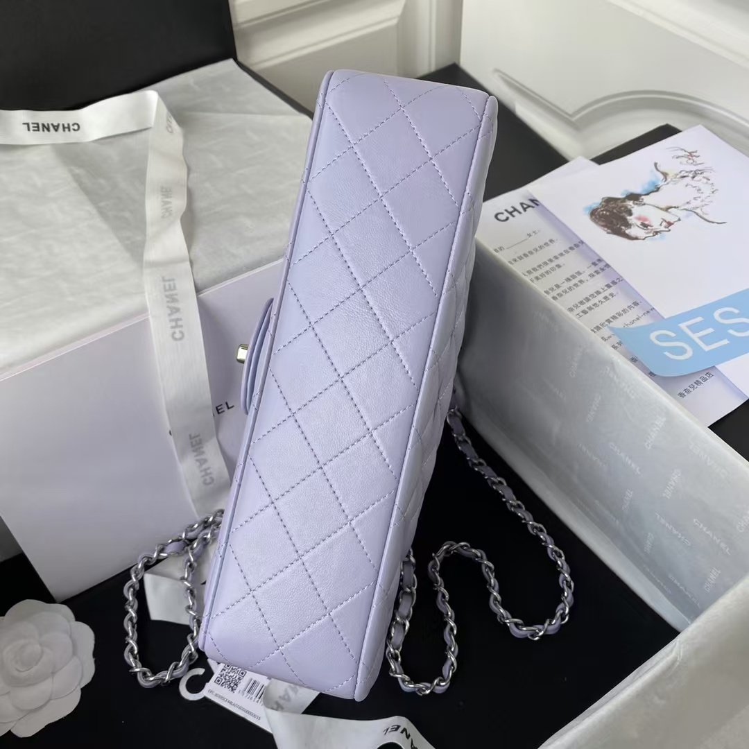 This medium classic double flap bag is crafted in light purple lambskin with silver hardware, front flap with signature CC turnlock closure, half-moon back pocket, adjustable interwoven silver chain and light purple leather shoulder strap.