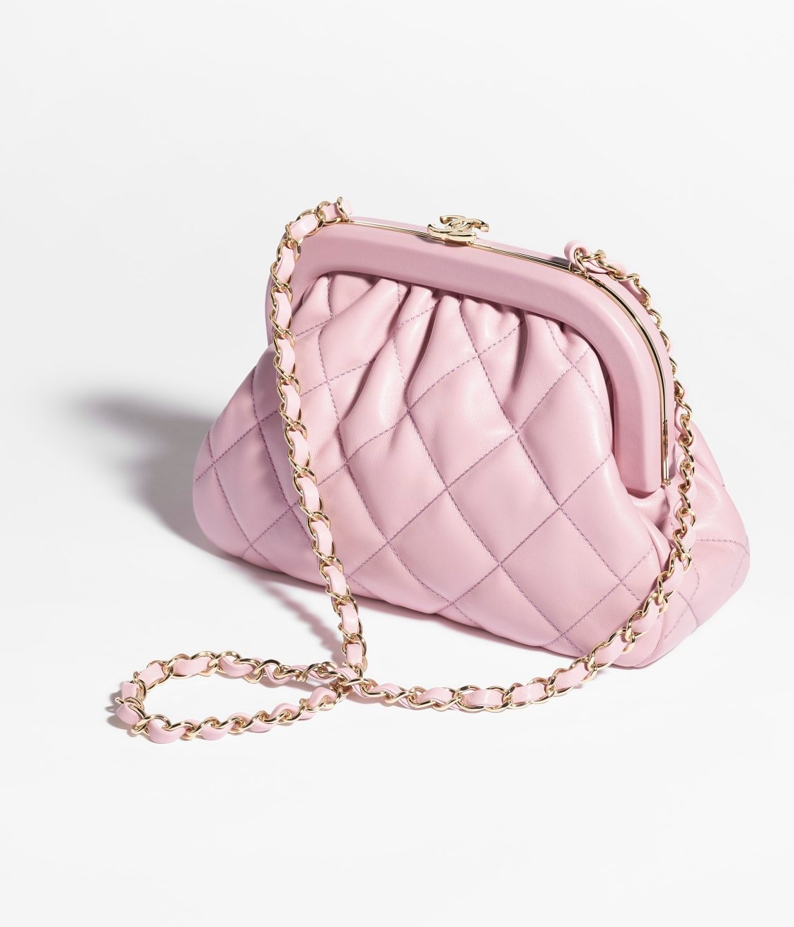 This Chanel Cloud Bag is made of pink lambskin with gold hardware, front CC logo in quilted satin, pink leather, top CC Kiss lock, interwoven gold-plated chain links and pink leather shoulder/crossbody strap