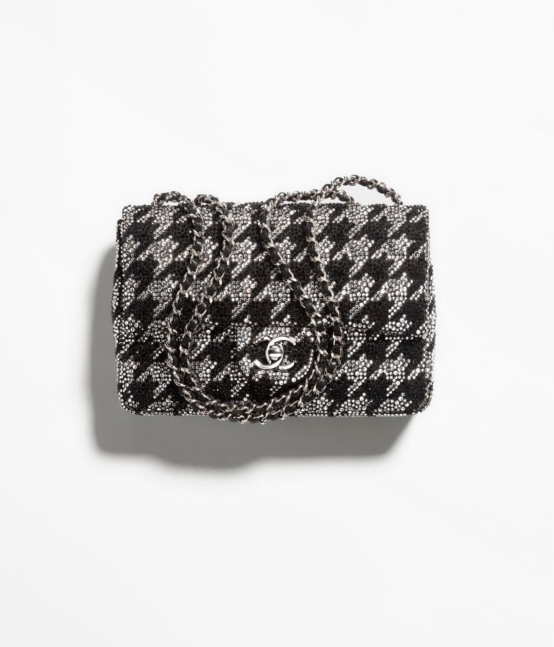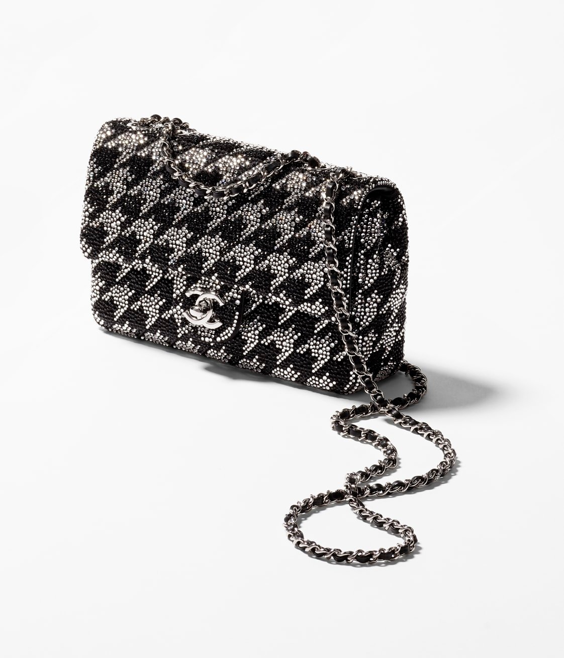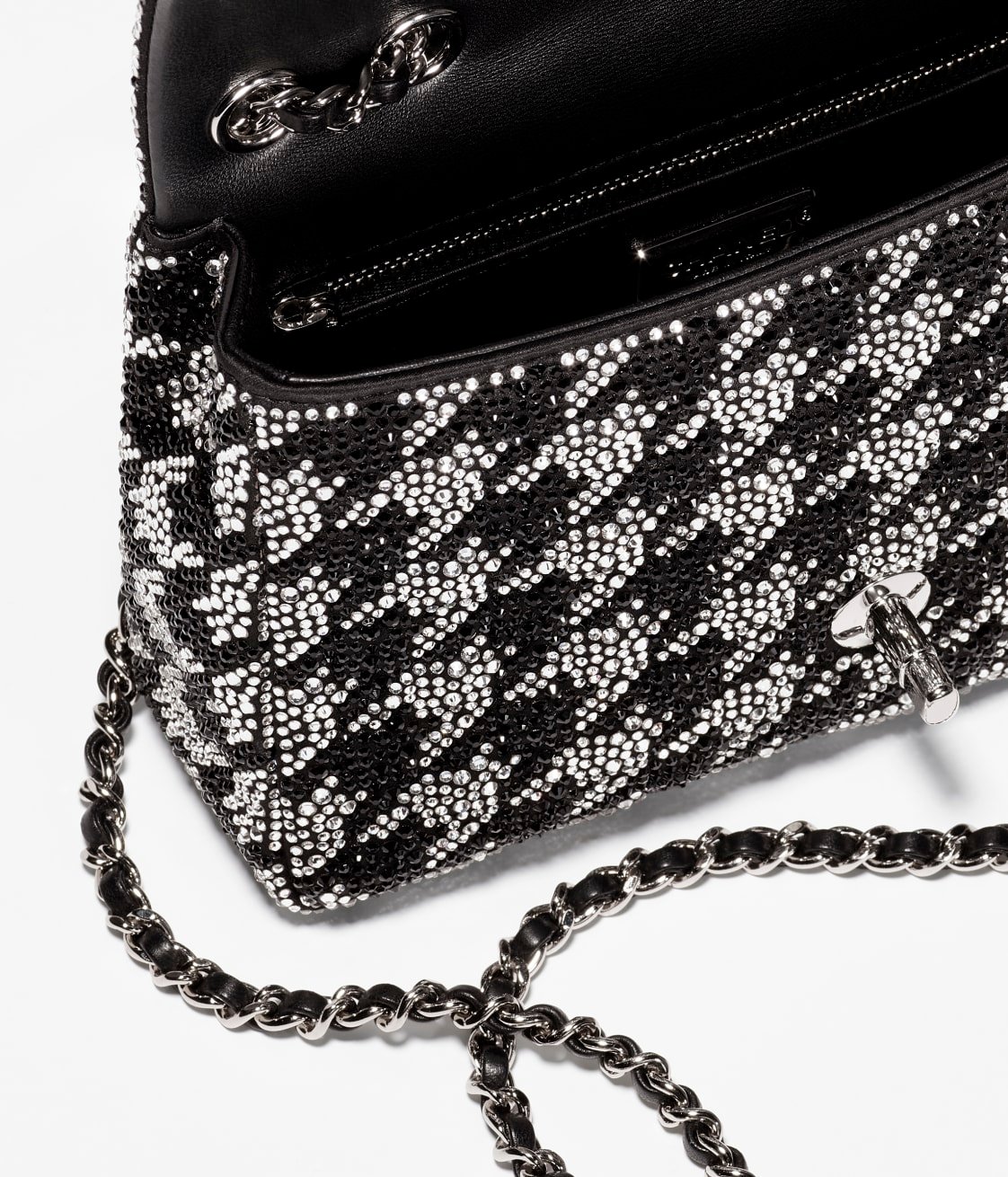 This flap bag is crafted with black and white crystal inlays and features silver-tone hardware. It has a front flap with the signature CC turnlock closure, and an interwoven black leather and silver-tone chain link shoulder/crossbody strap.