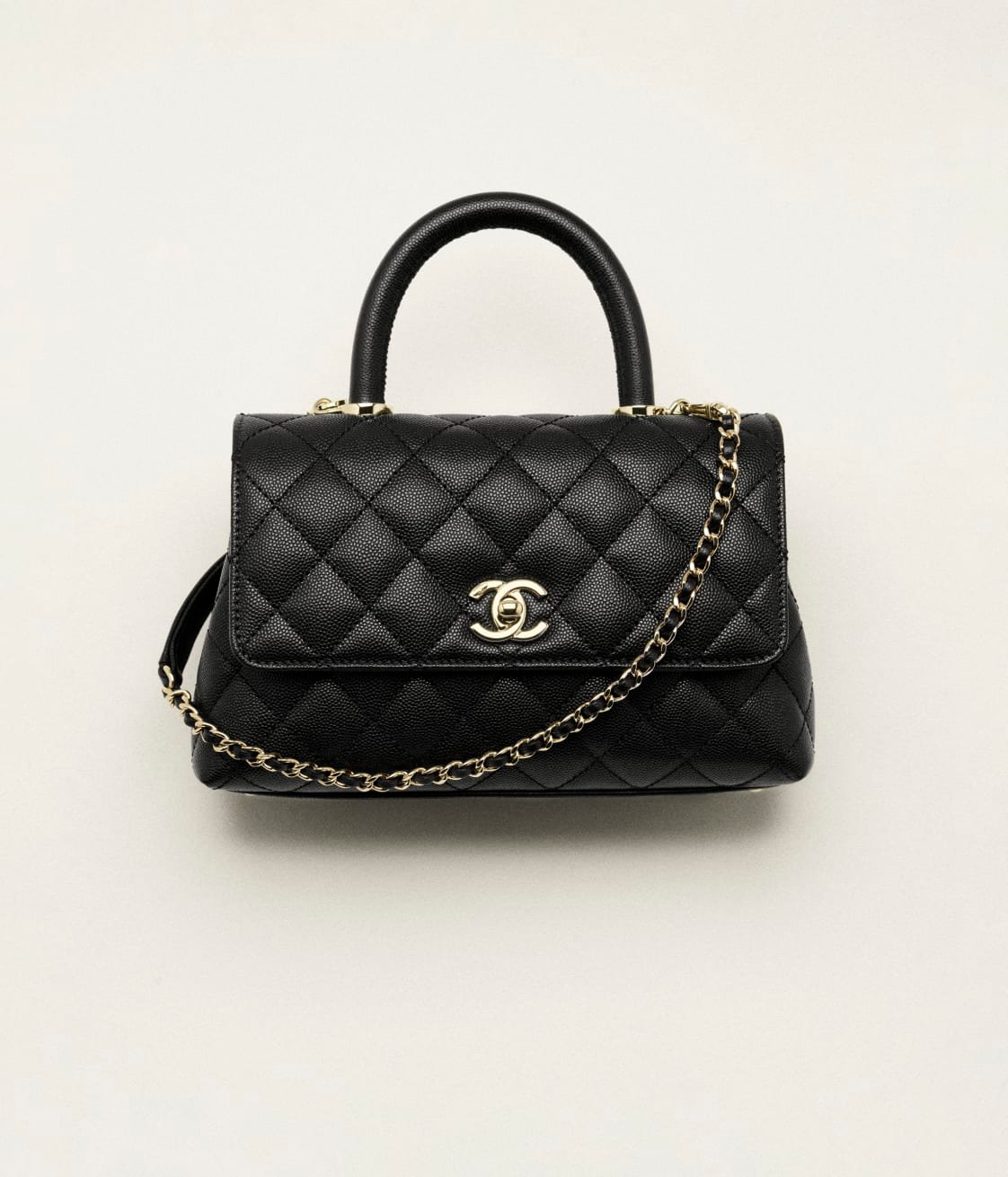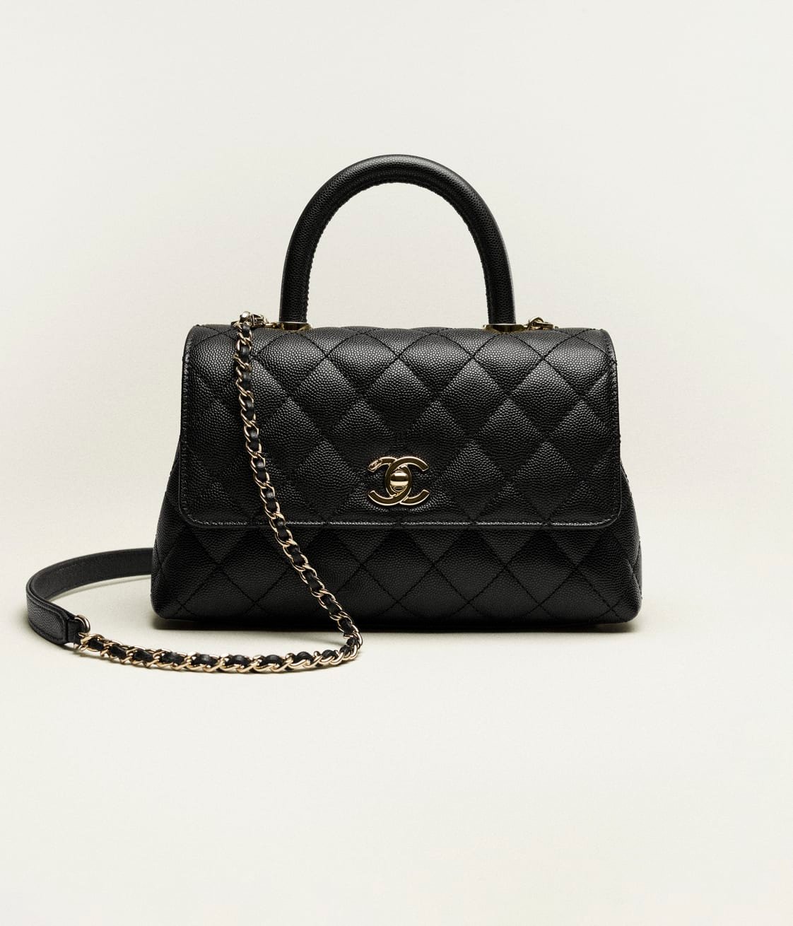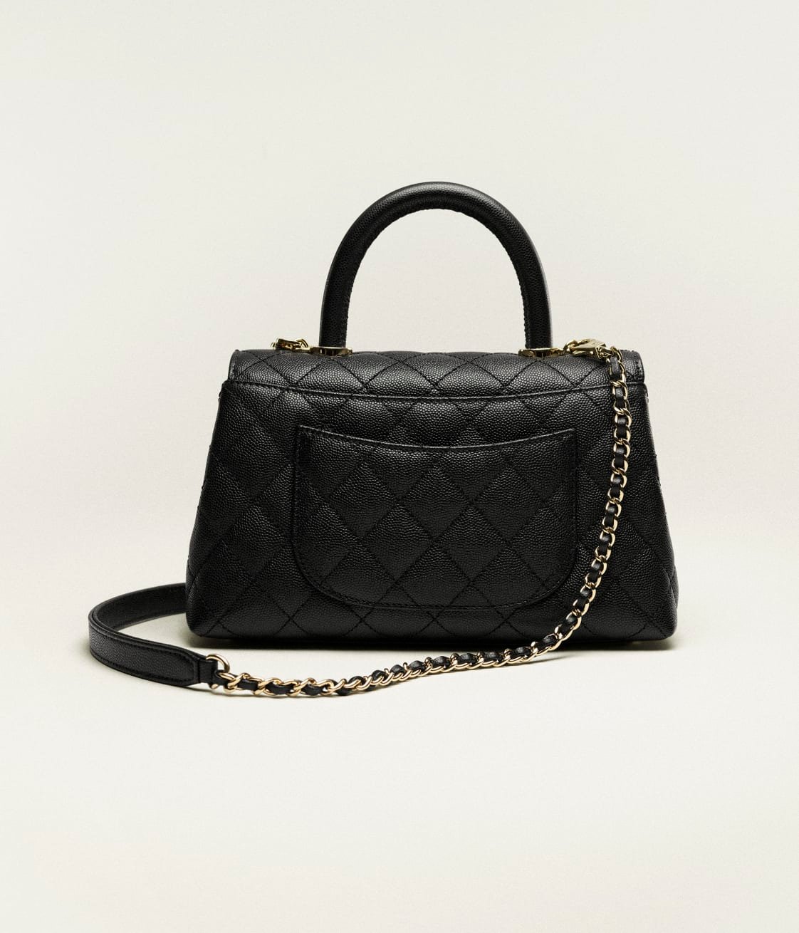 This medium rectangular flap bag with top handle is made of black lambskin with gold hardware, front flap with CC turn lock closure, half moon back pocket, top handle and black leather shoulder/crossbody strap.