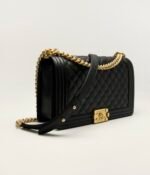 This Chanel Large Boy Bag is crafted in black lambskin leather with gold hardware, tone-on-tone stitching, front flap with Le Vintage Boy CC snaps, smooth leather trim, bronze gold chain links and black leather shoulder strap.