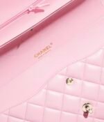 This Chanel Large Flap Bag is crafted from pink lambskin with brushed light gold hardware, front flap with large CC turnlock closure, half-moon back pocket, adjustable interwoven brushed light gold chain link and pink leather shoulder strap.