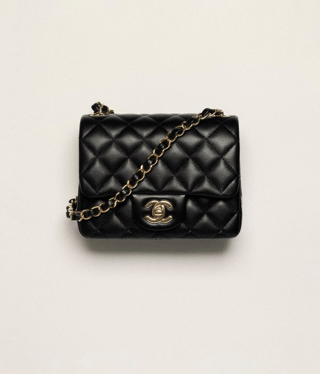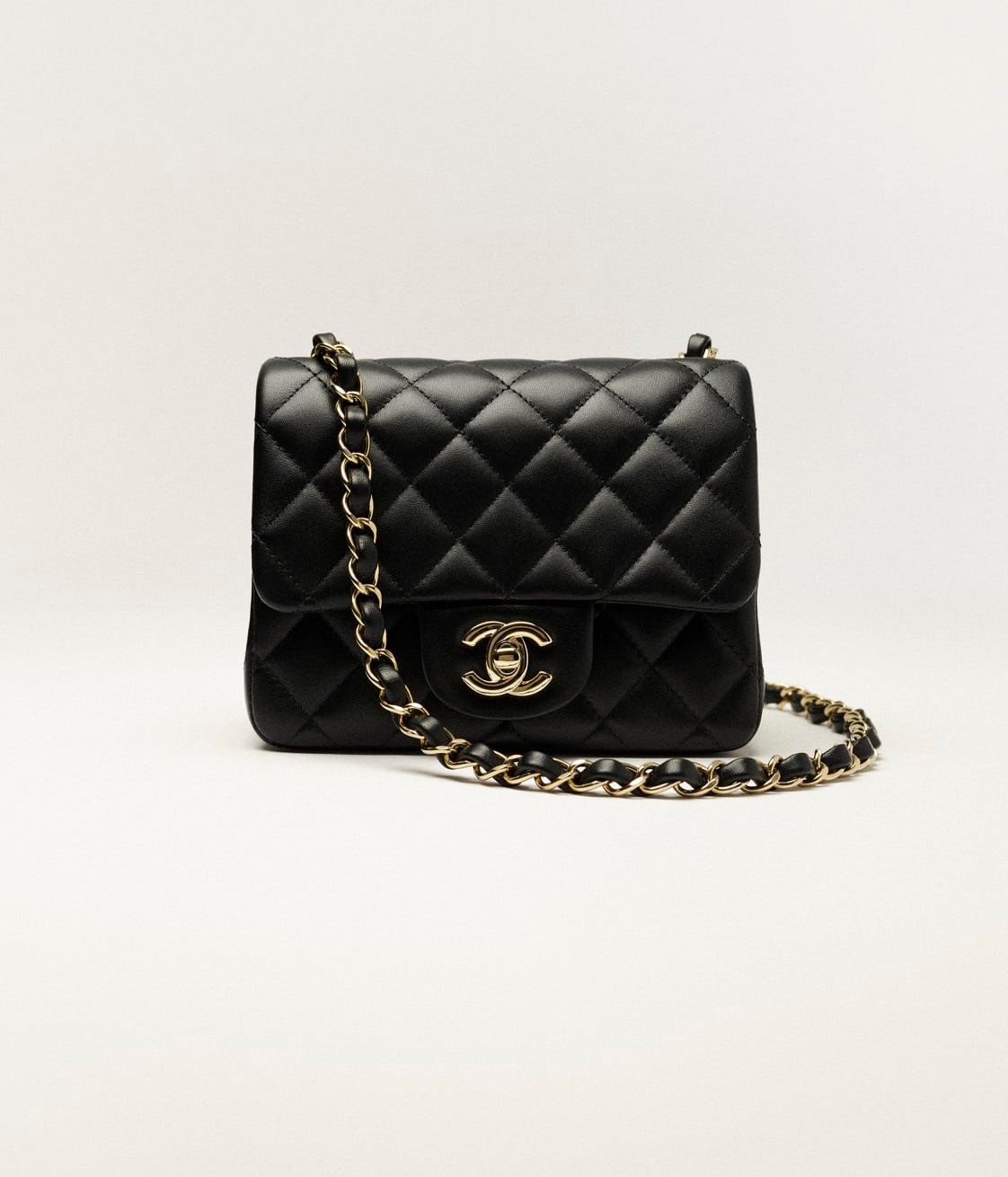 This Chanel Classic Mini Square flap bag is in black lambskin leather with light gold tone hardware and has a front flap with signature CC turnlock closure, tonal stitching, rear half moon pocket and single interwoven black leather and light gold tone chain link shoulder/crossbody strap.