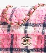 This Chanel Mini Classic Rectangular Flap Bag is in pink, white and blacktweed boucle with light gold hardware and has a front flap with signature CC turnlock closure, a half moon rear pocket, and an interwoven light gold chain link and pink leather shoulder/crossbody strap.