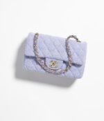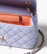 This mini classic rectangular flap bag is made of purple tweed with gold hardware, front flap with CC turnlock closure, half-moon back pocket and interwoven gold chain links and purple leather shoulder/crossbody strap.