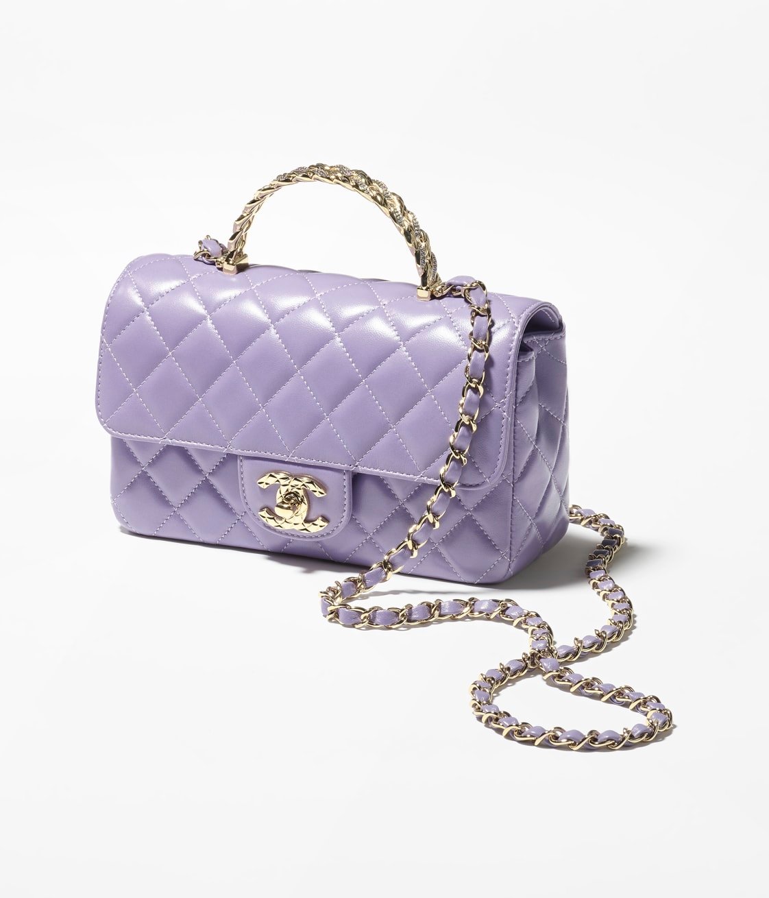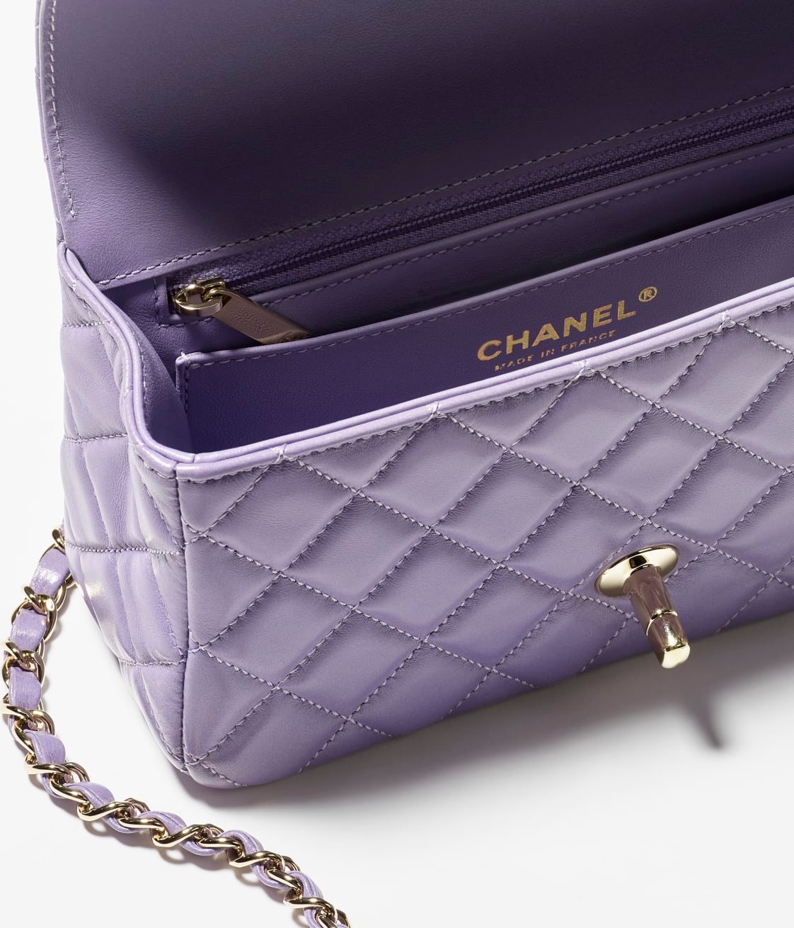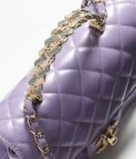 Made from purple lambskin and light gold hardware, this flap bag features the signature CC turnlock closure on the front flap, a half-moon pocket on the back, and an interwoven purple leather and light gold chain link shoulder/crossbody strap.