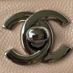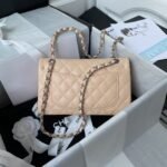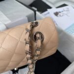 This small Classic Double Flap Bag in beige caviar leather with silver hardware features a front flap with signature CC turnlock closure, half-moon back pockets and adjustable silver interwoven chain link and beige leather shoulder strap.