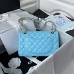 This small classic double flap bag is crafted in blue lambskin with light gold hardware, front flap with signature CC turnlock closure, half-moon back pocket, adjustable interwoven light gold chain and blue leather shoulder strap.