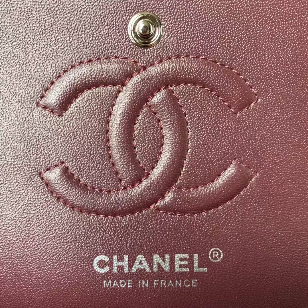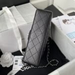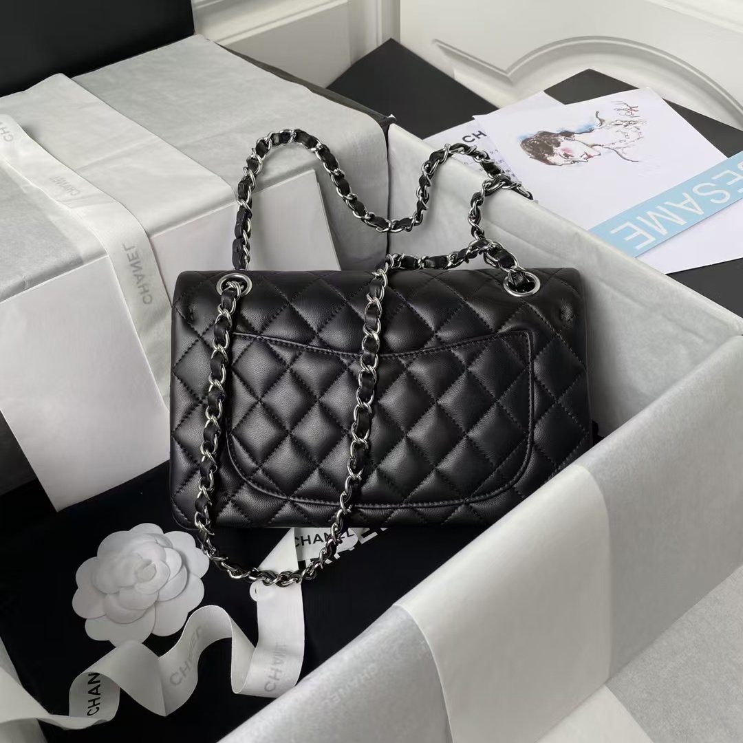 This small classic double flap bag is crafted in black lambskin with silver hardware, featuring the signature CC turnlock closure on the front flap, half-moon back pockets, adjustable silver interwoven chain links and a black leather shoulder strap.
