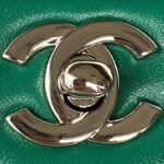 This small classic double flap bag is crafted in green lambskin with silver hardware, front flap with signature CC turnlock closure, half-moon back pocket, adjustable interwoven silver chain and green leather shoulder strap.