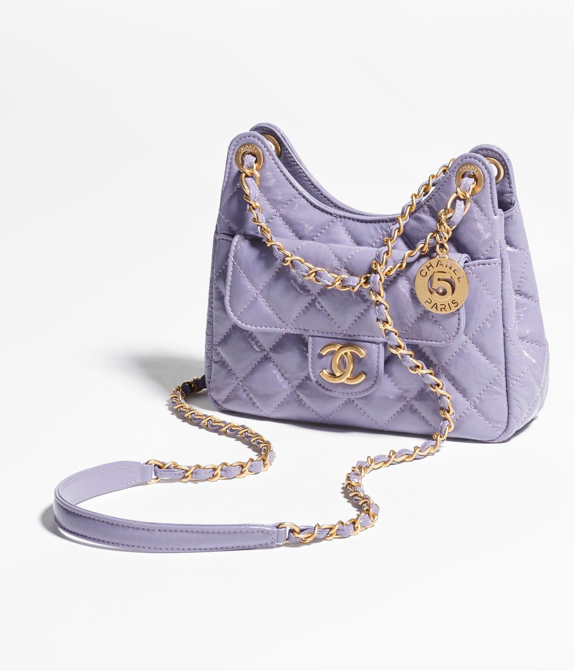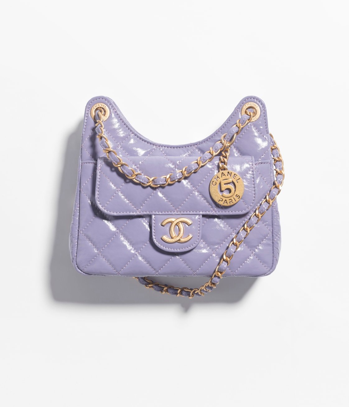 This Chanel Purple Quilted Shiny Crinkled Calfskin Small Hobo Bag features a front flap pocket with CC logo. Shiny crinkled calfskin feels exquisite and luxurious. Magnetic closure. One pocket on the back with magnetic closure. Dangling number 5 plaque. Distressed/antique gold-tone hardware. Lined in fabric. This bag is perfect for everyday use.
