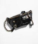 This black shiny calfskin belt bag with light gold hardware features tonal stitching and light gold hardware on the front, two small front pockets with magnetic closures, gold metal CC logo, zip pocket on the belt bag, light gold and metal interweaving, black leather chain link belt/crossbody strap.
