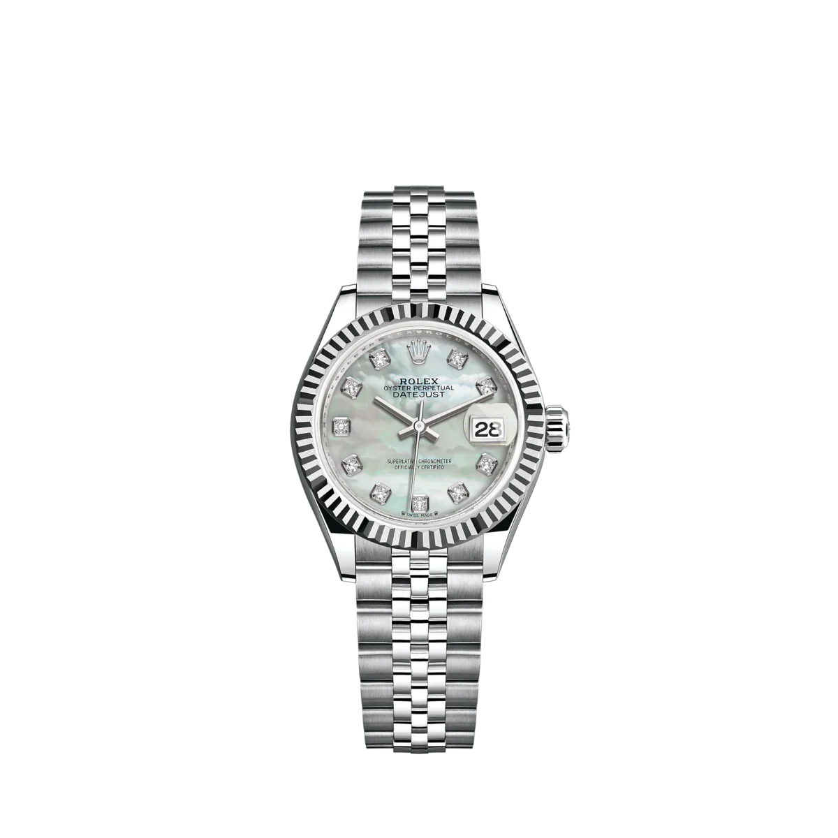 The light reflections on the case sides and lugs highlight the elegant profile of the 28 mm Oyster case, which is fitted with a fluted bezel. Rolex’s classic feminine watch, the Lady-Datejust is in the lineage of the Datejust, the emblematic model that has been a byword for style and accurate timekeeping.