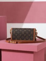 The Dauphine East-West Monogram handbag canvas sports a fashionably elongated silhouette, echoed in the Dauphine iconic rectangular LV closure. The interplay of two complementary Monogram canvases – classic and Reverse – lends this piece a signature appeal. The leather shoulder strap and the golden chain are both removable, offering a variety of styling options.