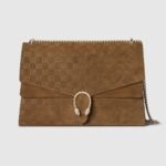 Gucci presents a large version of the signature Dionysus shoulder bag. Crafted from brown GG suede, this iteration features a tiger head closure with a flap and a sliding chain that can be adjusted to wear with the preferred length and style.
