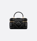 New for Summer 2024, the Dior Caro mini vanity case enhances the line with a compact design that is both functional and refined. Crafted in black lambskin, it stands out with the original quilted effect of the Macrocannage stitching, as well as a CD signature on the front. The vanity case will accommodate the essentials and is completed by a pocket and interior mirror. It can be carried by hand using the handle or worn over the shoulder or crossbody using the adjustable and removable chain strap featuring alternating gold-finish metal and black enamel links with a leather insert.