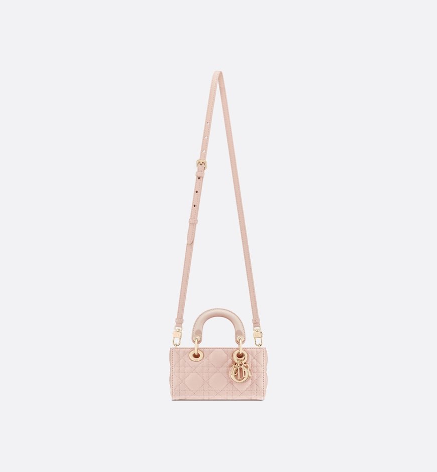 The Lady D-Joy micro bag captures the House’s vision of elegance and beauty by showcasing the iconic streamlined aesthetic of the Lady Dior line. Sleek and refined, the timeless creation is crafted in powder pink lambskin with Cannage topstitching and enhanced by a pale gold-finish metal D.I.O.R. charm. Featuring one removable chain strap and another adjustable and removable leather strap, the Lady D-Joy bag can be carried by hand, worn over the shoulder or crossbody as an ideal day or evening companion.