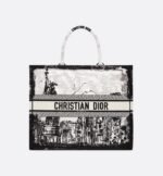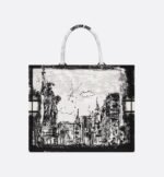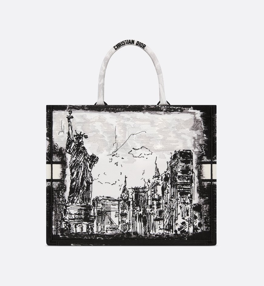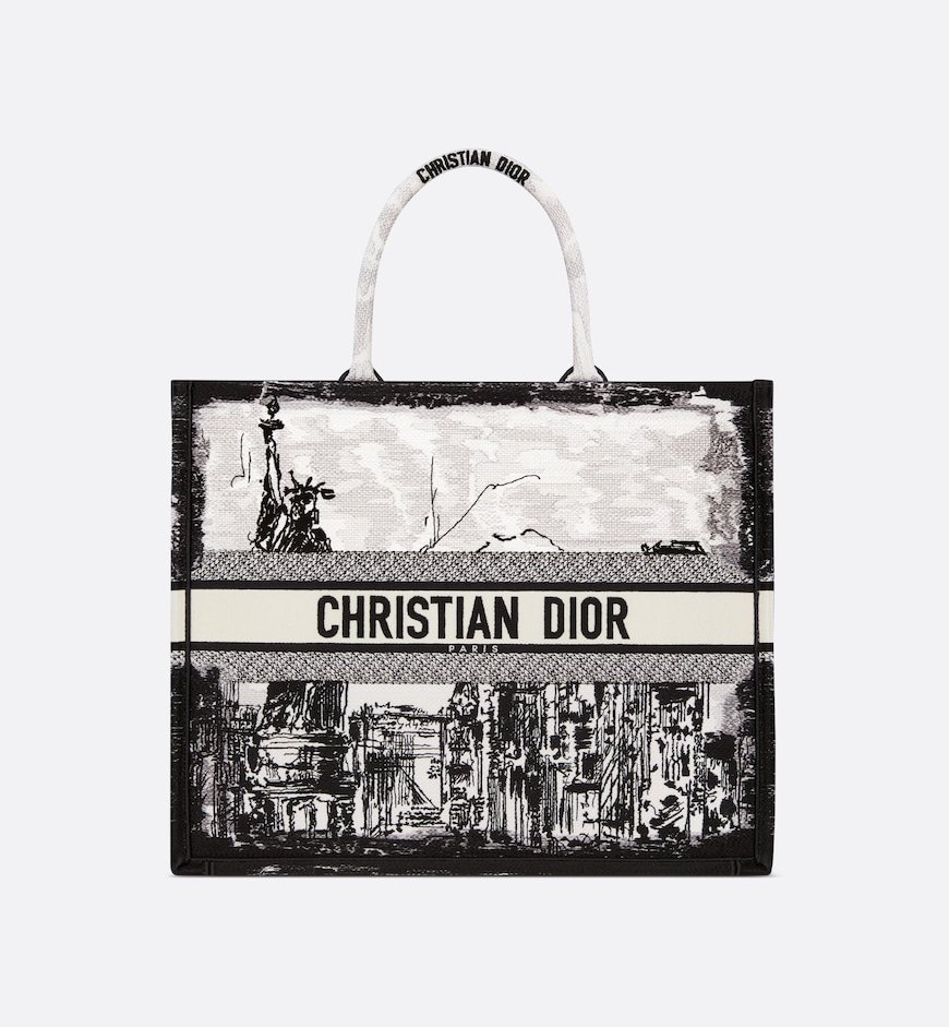 Introduced by Maria Grazia Chiuri, Creative Director of Christian Dior, the Dior Book Tote has become a staple of the Dior aesthetic. Designed to hold all the daily essentials, it is fully embroidered with the white and black New York motif, a pillar of the collection that celebrates the city’s skyline and the Statue of Liberty in a graphic spirit. Adorned with a contrasting Christian Dior Paris signature on the front, the large tote exemplifies the House’s savoir-faire and may be carried by hand.