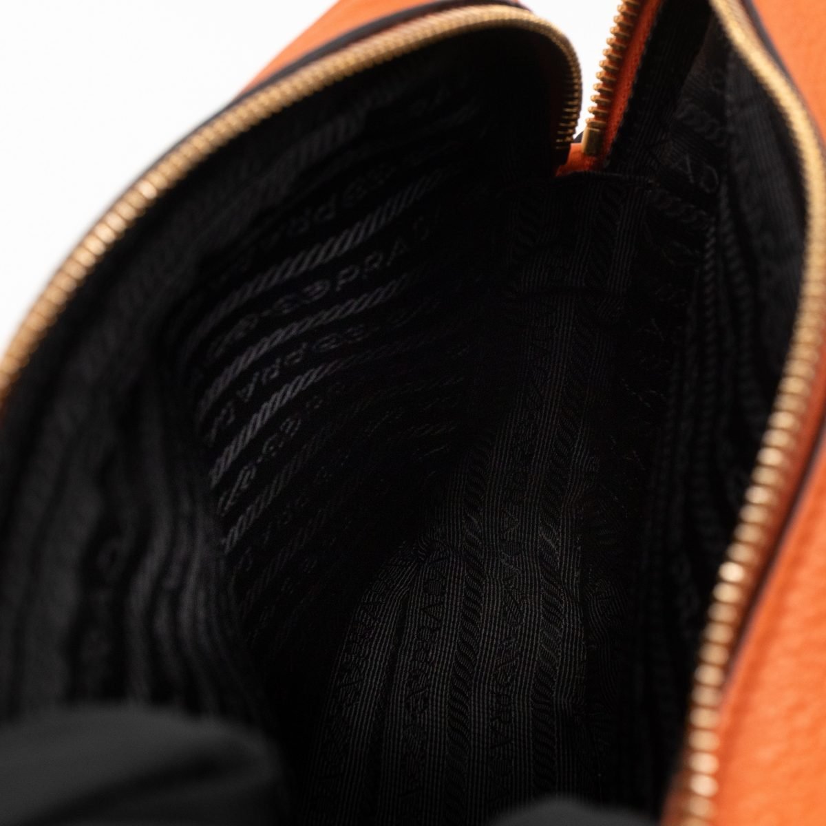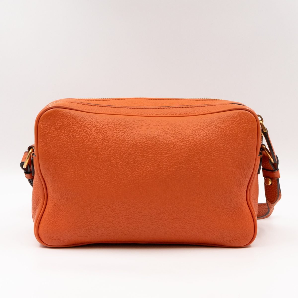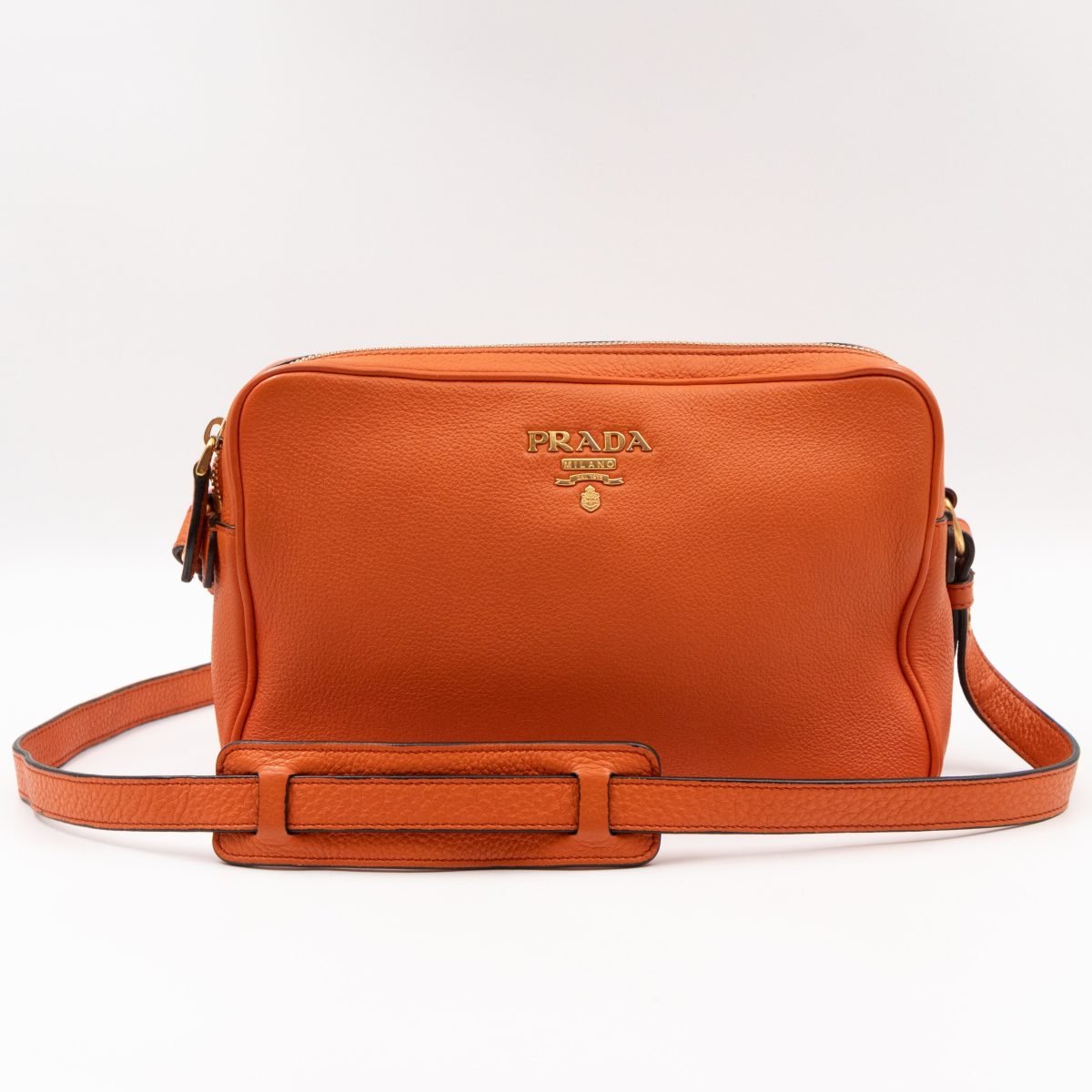 This is a Prada Double Zip Camera Bag. Made in orange phenix vitello leather. This bag has a shoulder strap for comfortable crossbody use. On front a Prada logo in gold-tone. It has double zip and each zipper opens to reveal a spacious compartment. Great for daily use for your phone, cards, and keys.