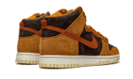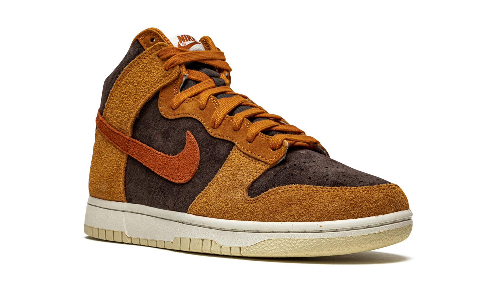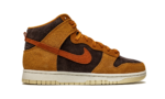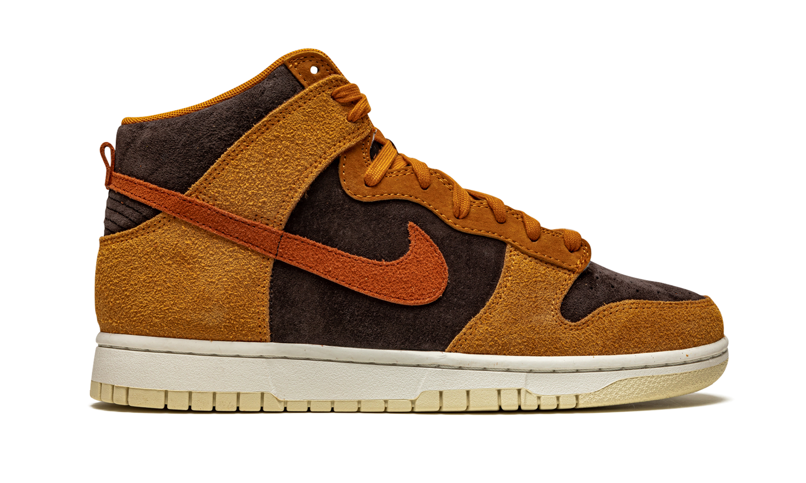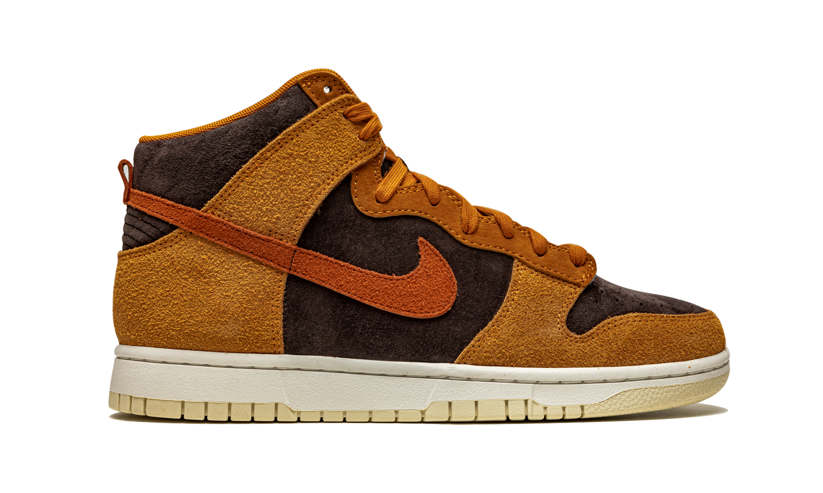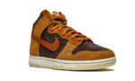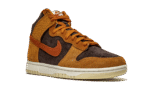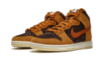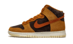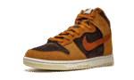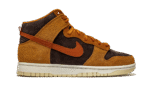 The Nike Dunk High “Dark Curry” puts an appealing lifestyle look on the timeless high-top shoe. The “Dark Curry” was released in March 2021 and exemplifies Nike’s efforts of expanding the Dunk’s footprint in sneakers. A year earlier, in 2020, the Nike Dunk re-emerged from relative obscurity to once again capture the attention of sneaker collectors due to an impressive amount of limited edition collaborations and returning retro colorways. As for the design of the “Dark Curry,” hairy orange-brown suede overlays on the model’s forefoot, eyelets, collar, and heel contrast the black brushed suede base. A darker shade of brown suede can be found on the Swoosh branding on either side and on the small pull tab on the heel. Nike layers brown laces over the black mesh tongue and adds a midsole for a timeless look. Underfoot, a tan outsole finishes off the look of the “Dark Curry.” Release date: March 5, 2021.
