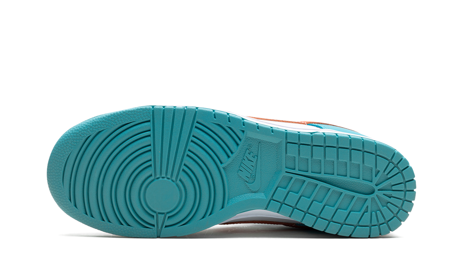 The Nike Dunk Low “Dolphins” is a colorway of the retro basketball sneaker that features the team uniform colors of the NFL’s Miami Dolphins. In no way officially affiliated with the Dolphins, the colorway nicknamed after the football team nonetheless salutes the squad by featuring its uniform colors on its design. The upper has a white leather base with aqua leather overlays. An orange leather Swoosh is seen on both sides of the shoe. “Nike” branding is embroidered in white lettering on the orange leather heel tab. Aqua “Nike” and Swoosh logos are seen on the tongue tag. A white rubber midsole and aqua rubber outsole complete the look.