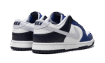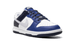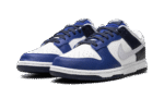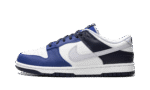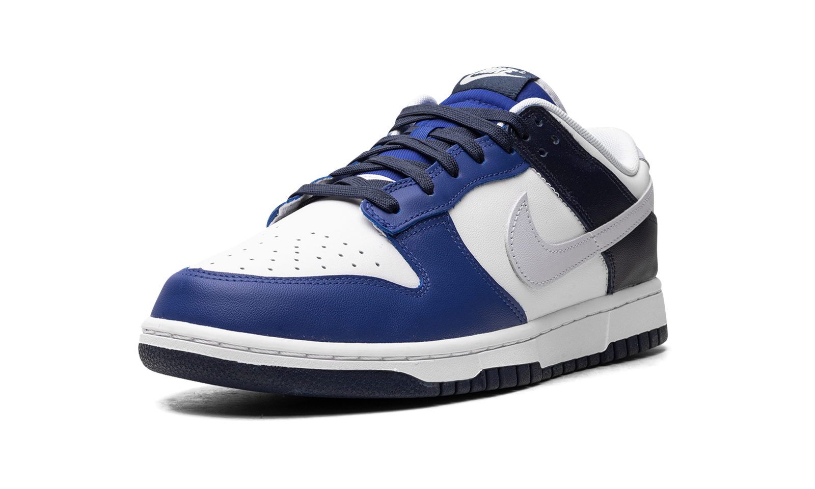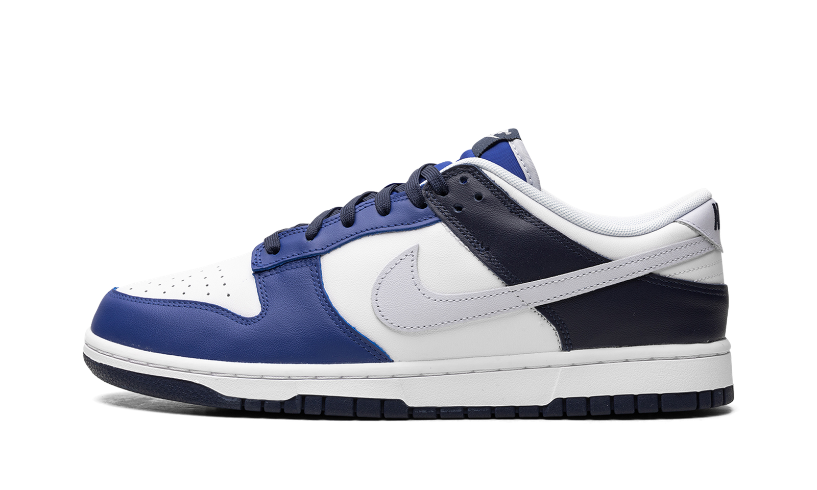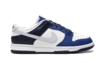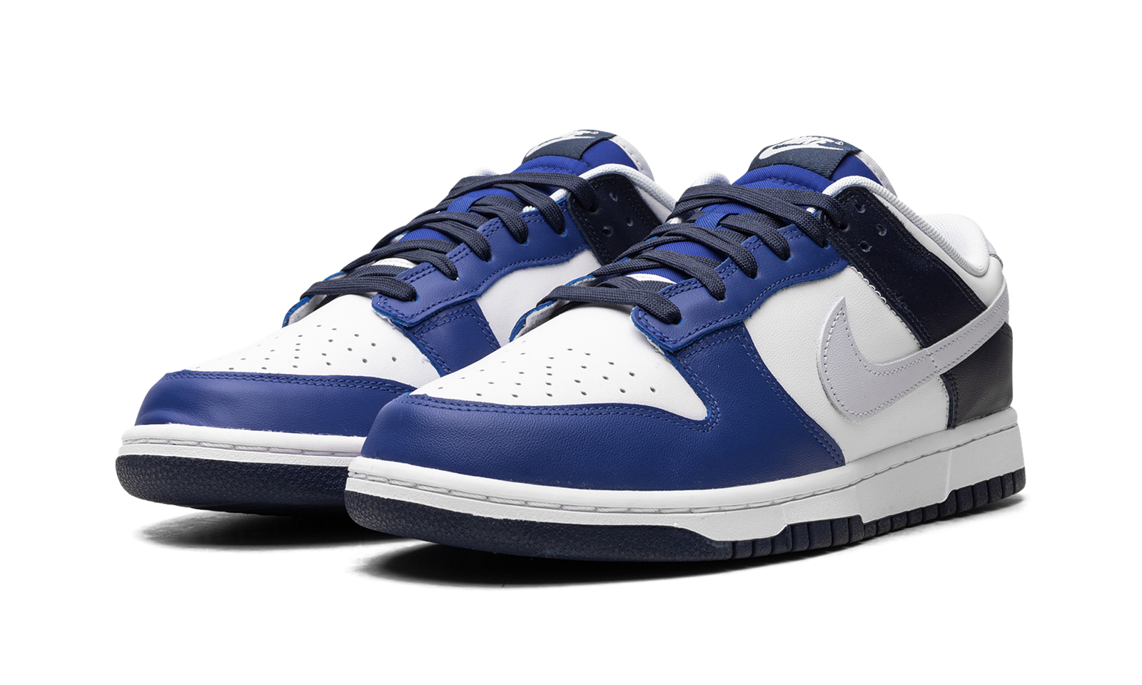 The Nike Dunk Low “Game Royal/Navy” is a colorway of the retro basketball shoe with different shades of blue on its design. The Dunk Low in “Game Royal” features a white leather base contrasted with Game Royal leather overlays on the toe cap, forefoot, and eyelet panels. Midnight Navy leather overlays appear on the collar and heel. A Football Grey leather Swoosh logo is seen on both sides. “Nike” branding is embroidered on the heel and printed on the tongue tag. Underfoot, a white midsole and navy outsole complete the look. Release date: November 3, 2023