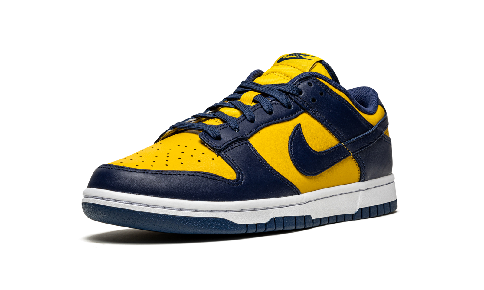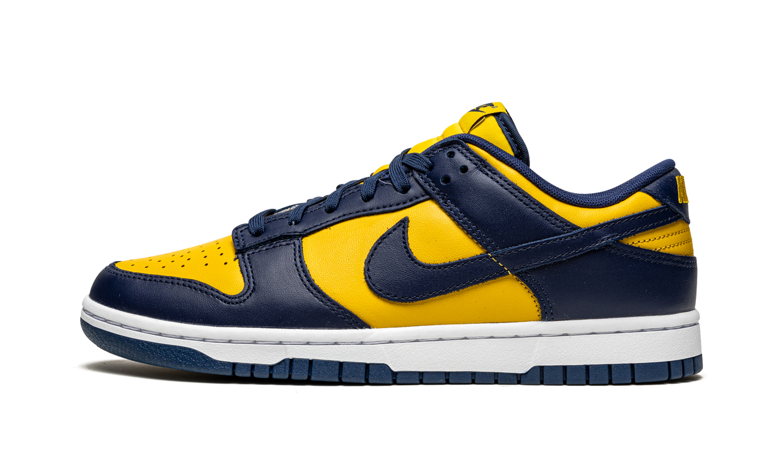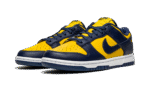 The Nike Dunk Low “Michigan” is the low-top version of an original Dunk colorway worn by the Michigan Wolverines basketball team in 1985. The “Michigan” first appeared in 1985’s “Be True to Your School” collection of college basketball inspired Dunks. The Varsity Maize and Midnight Navy design was brought back in September 2020 on the Dunk High. This low-top silhouette of the retro basketball model follows the same style cadence as the original and high-top edition. Varsity Maize leather appears on the perforated toe and on the mid-panel, collar, and heel. Contrasting Midnight Navy leather panels on the upper break up the look. A navy blue Swoosh graces either side of the shoe and yellow “Nike” embroidery is stitched onto the heel. Blue shoe laces are layered over the Varsity Maize nylon tongue. The Nike Dunk Low “Michigan” is an iconic colorway of the retro basketball, skateboarding, and lifestyle shoe. Release date: April 16, 2021.