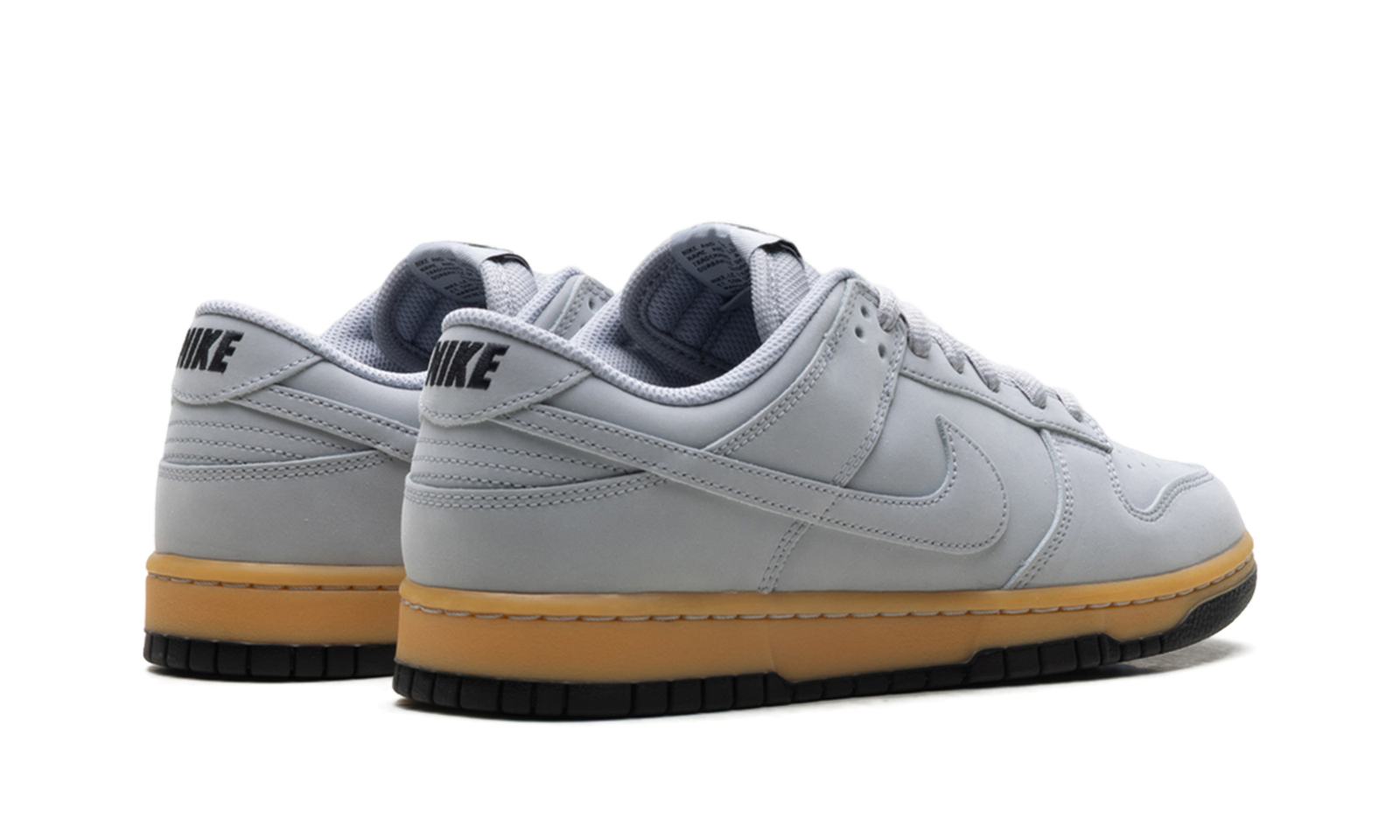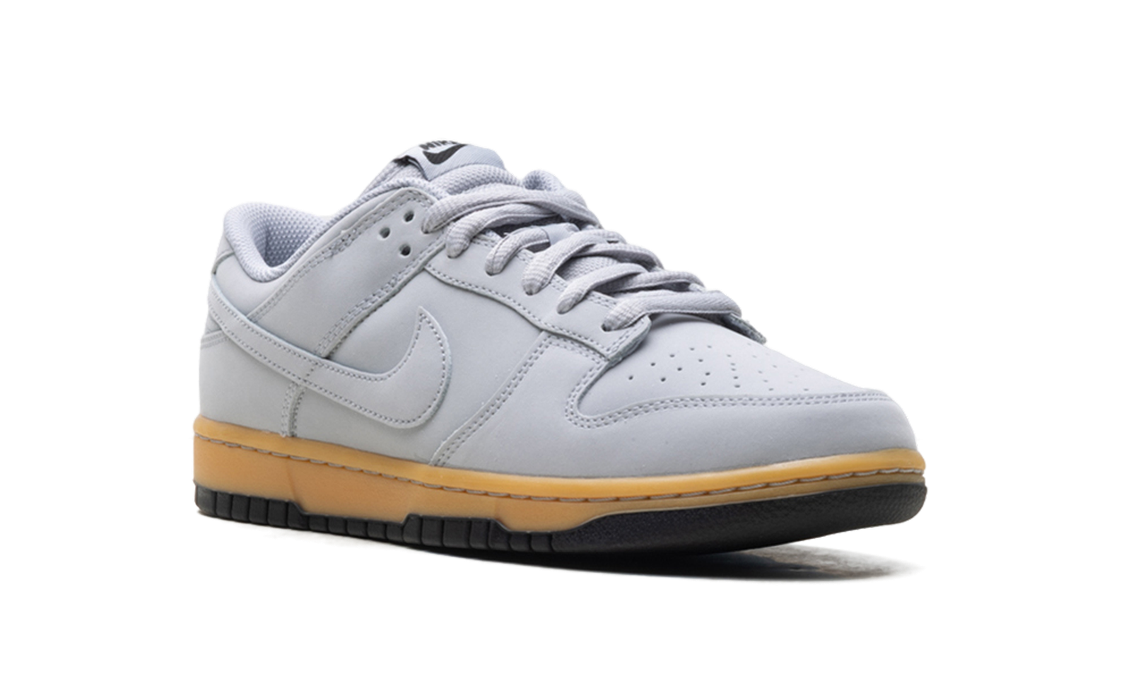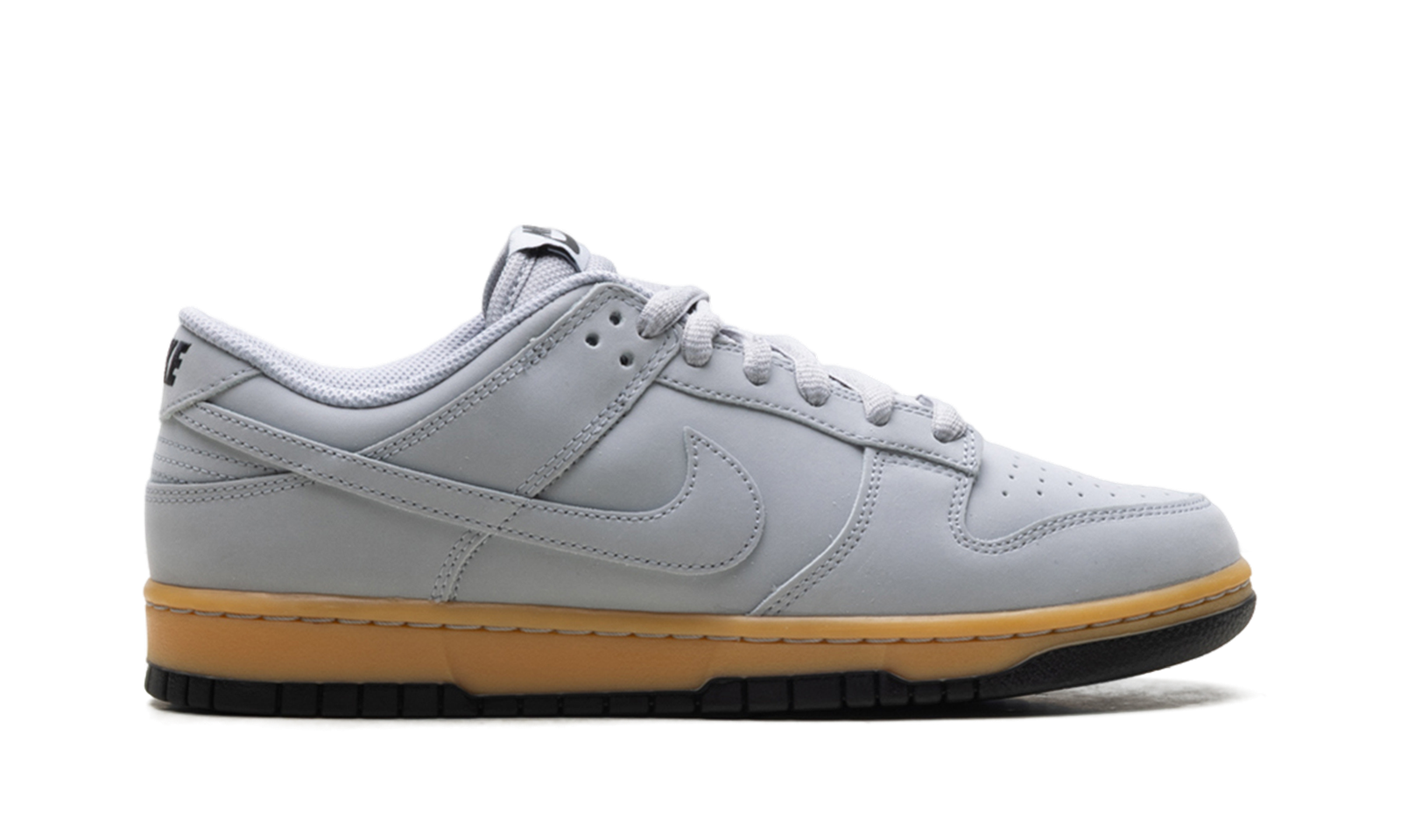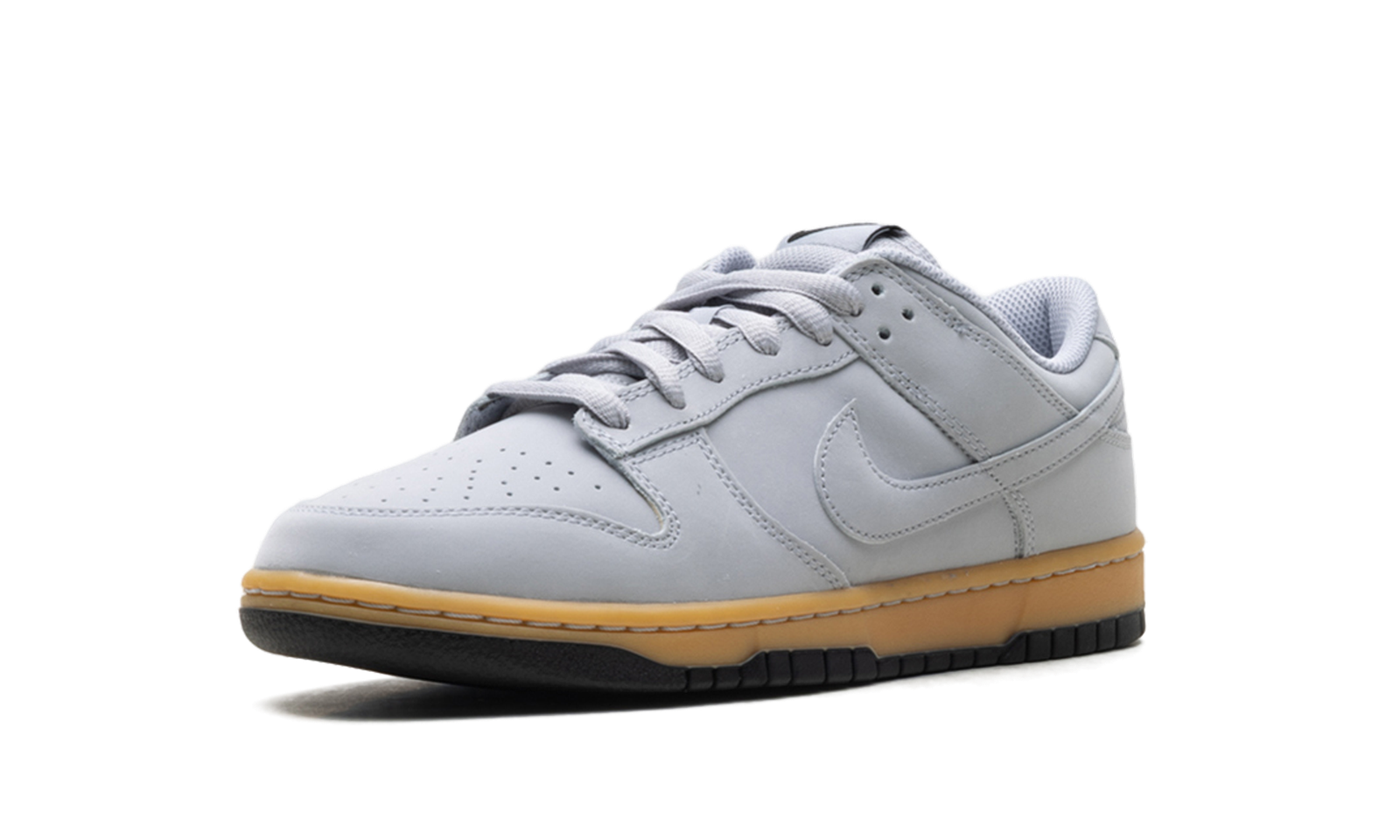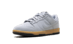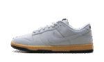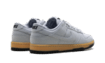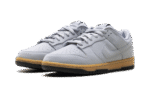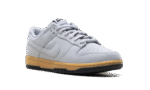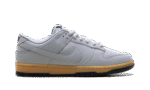 The Nike Dunk Low SE ‘Wolf Grey Gum’ showcases a neutral grey finish on the leather upper, featuring a perforated toe box and a breathable mesh tongue.