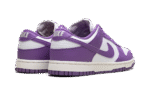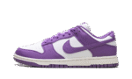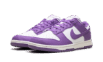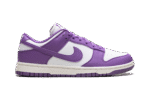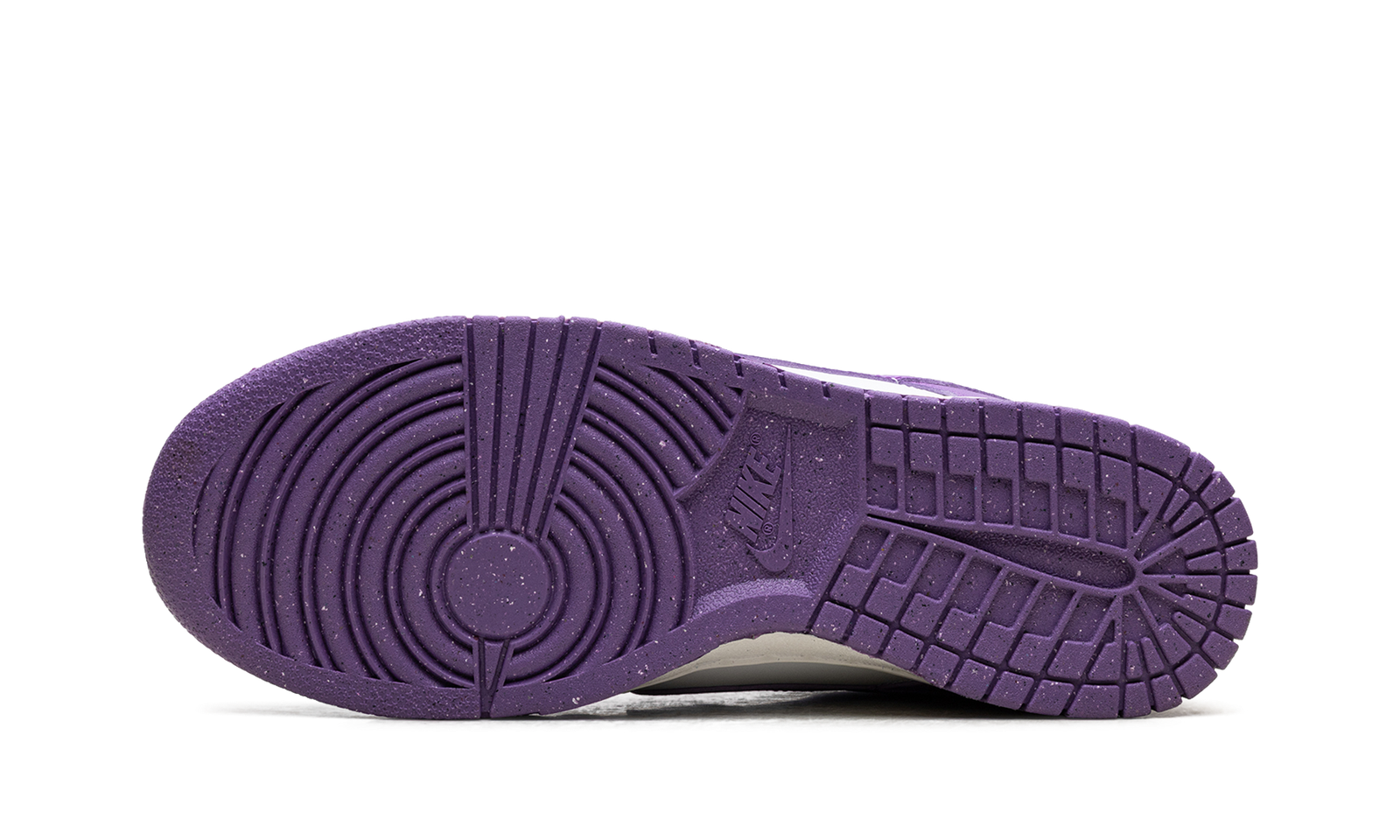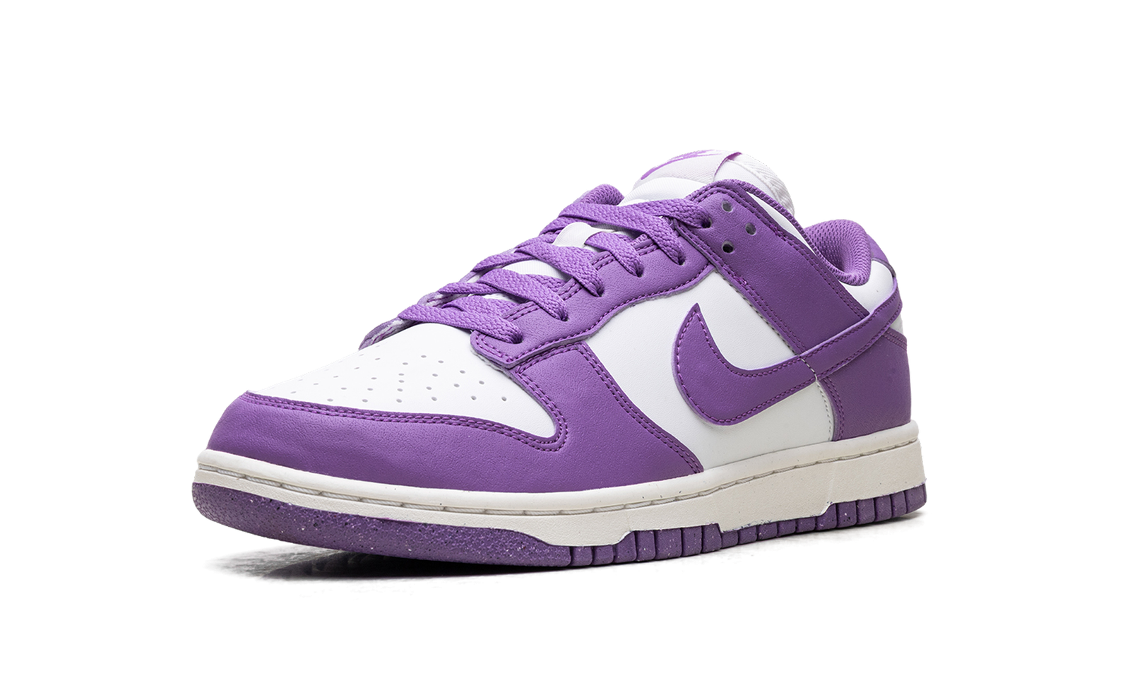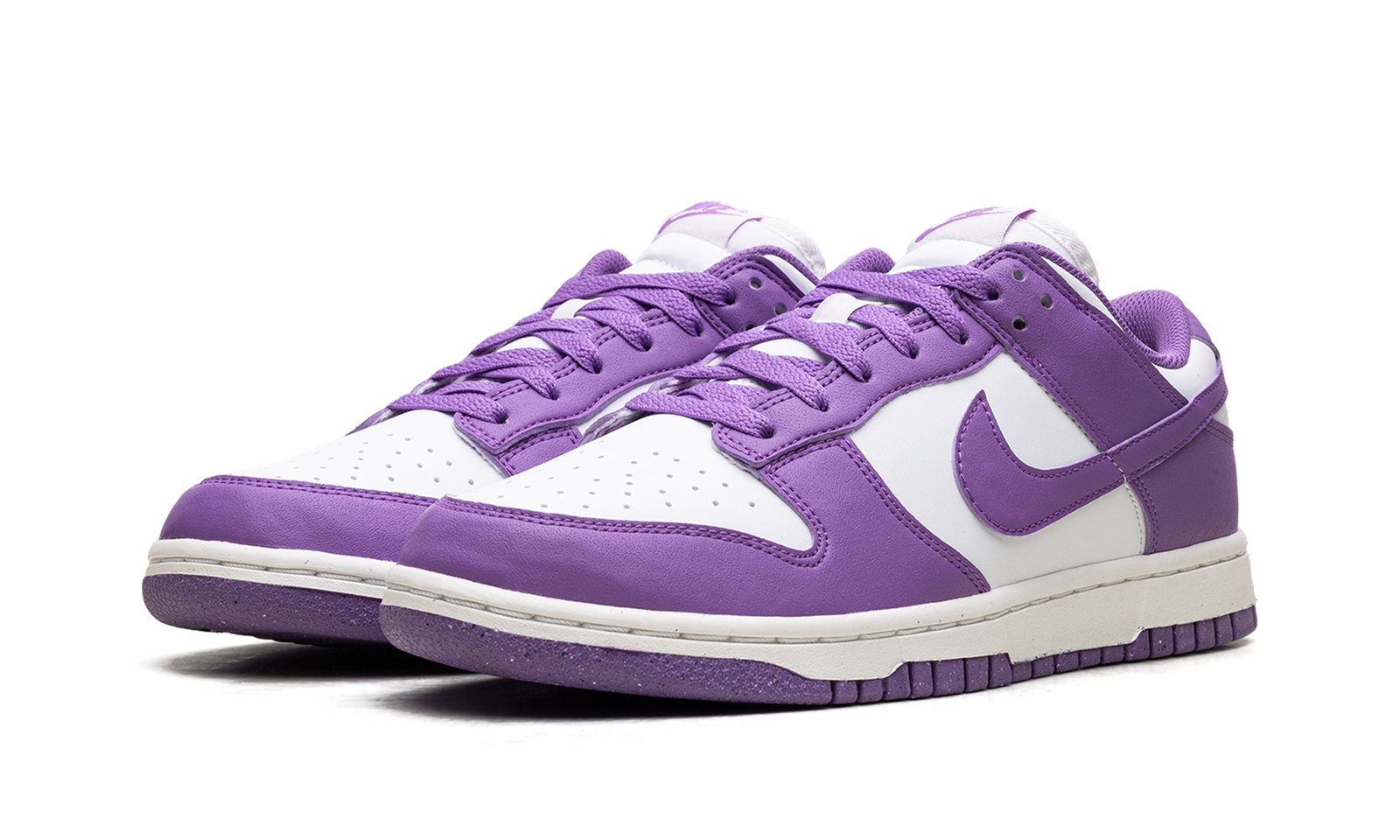 The women’s Black Rasperry Nike Dunk Low Next Nature has a smooth Summit White leather upper as its base. This color forms the sides, the perforated toe box, and the ankle area. Slightly shiny Black Raspberry purple overlays form the toe cap, eyestays, ankle strap, and heel, as well as the Nike Swooshes that adorn the sides.