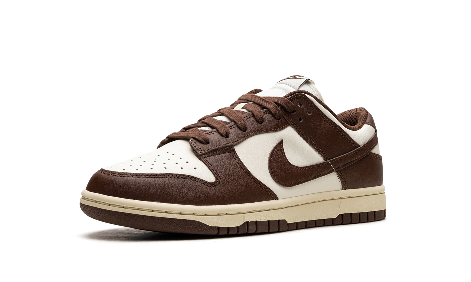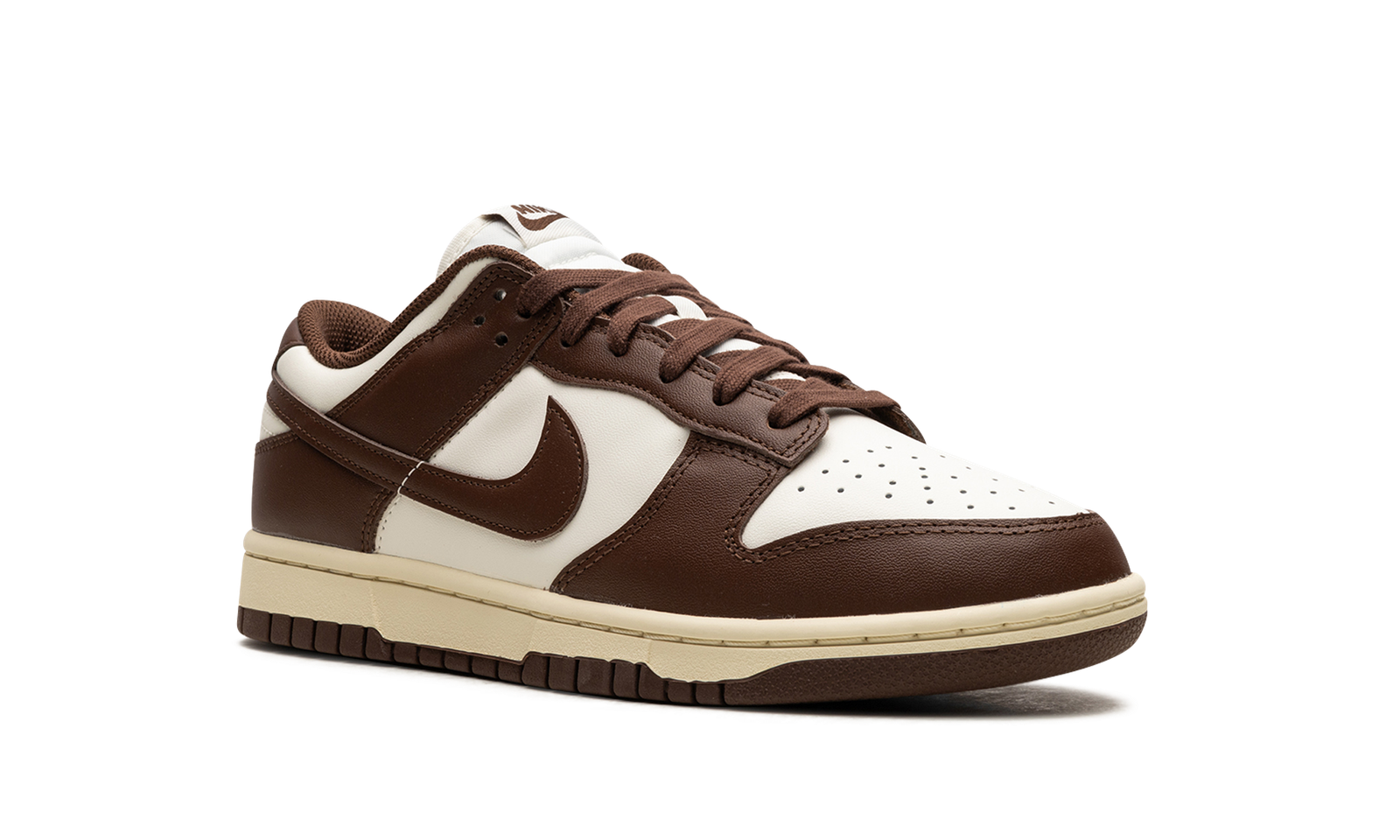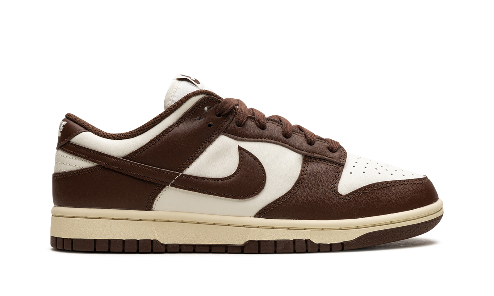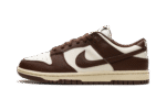 The Women’s Nike Dunk Low “Cacao Wow” is a women’s-exclusive colorway of the retro basketball shoe with an old school look. Called the “Cacao Wow” colorway by Nike, this Dunk Low features an off-white white upper with Cacao Wow, or brown, leather overlays and Swoosh branding. Classic “Nike” branding is embroidered on the back of the collar and “Nike” and Swoosh branding are found on the tongue tag. Underfoot, the shoe’s aged-looking midsole gives the silhouette a classic, vintage look.
