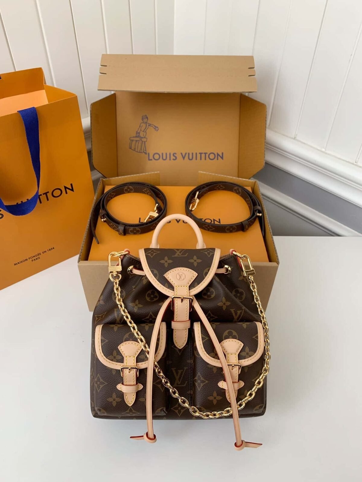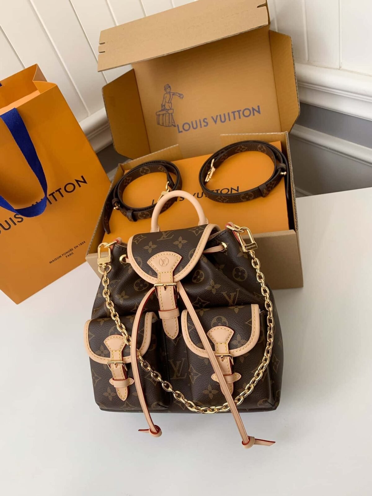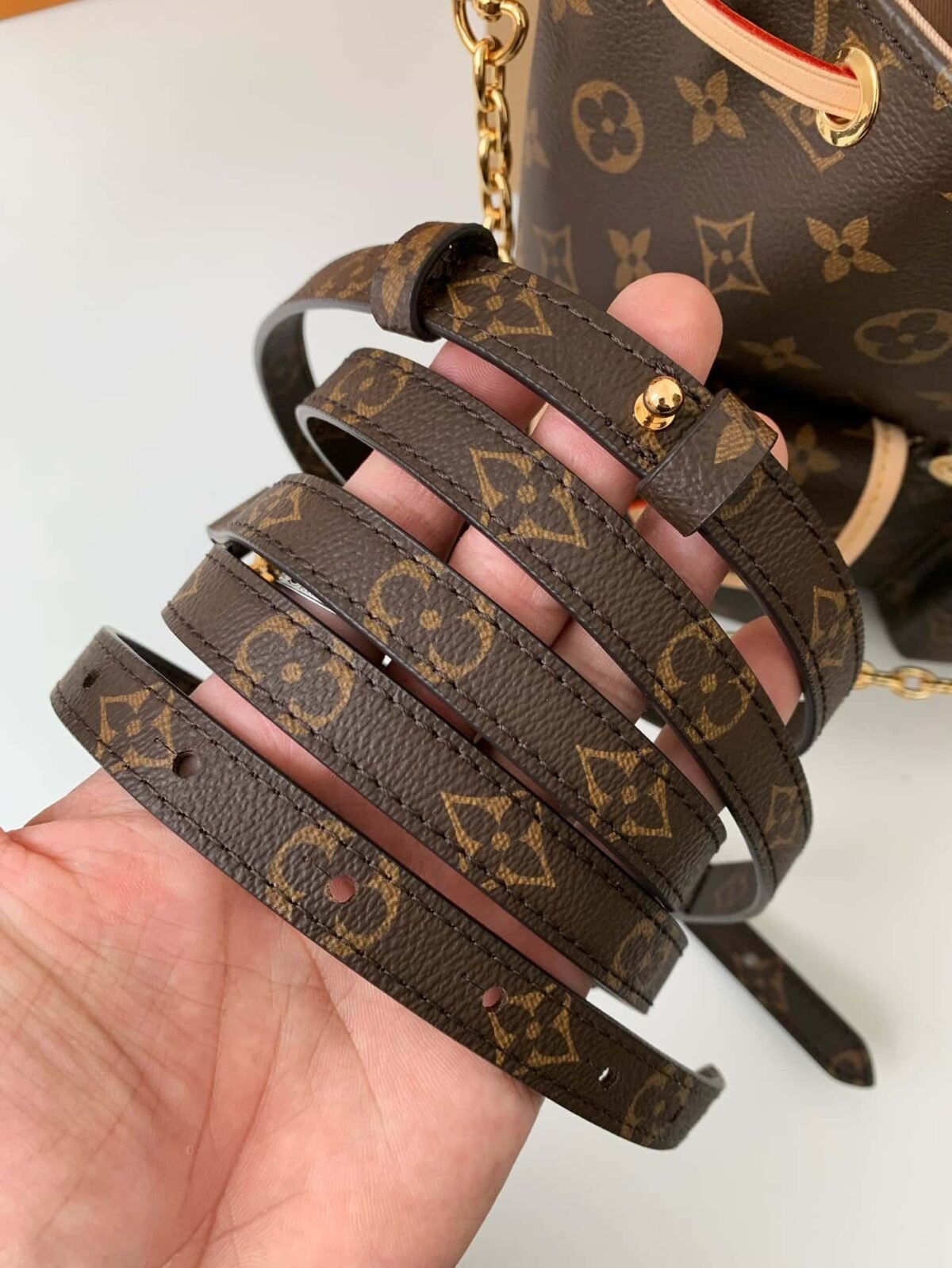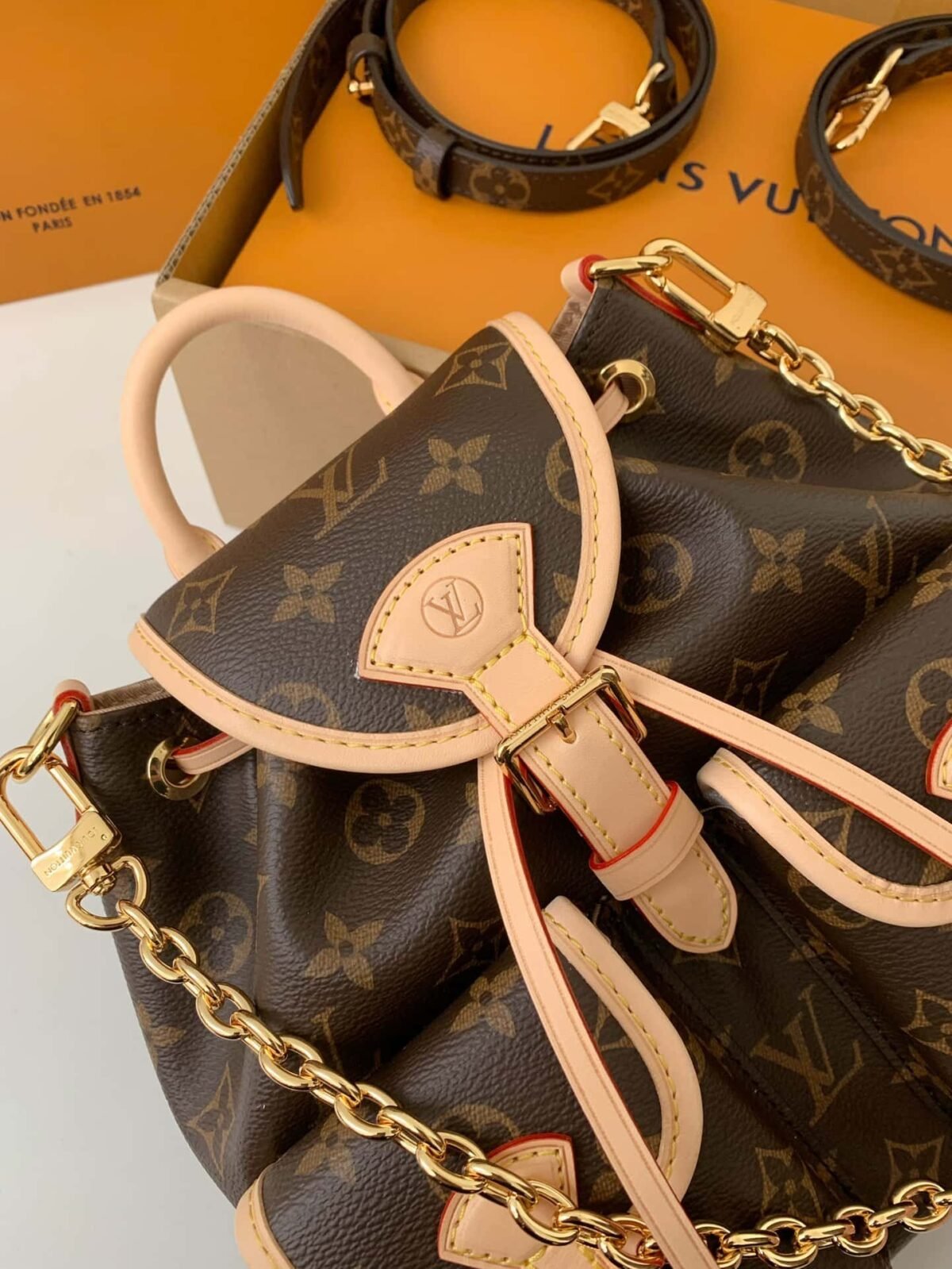 Made from Monogram canvas with leather trim, the super-cute, super-functional Excursion PM backpack has a design clearly influenced by the world of hiking. The main compartment closes with an adjustable sliding buckle and there are two pockets with buckles on the front. A gold-color chain, in addition to the top handle, enable different carries.
