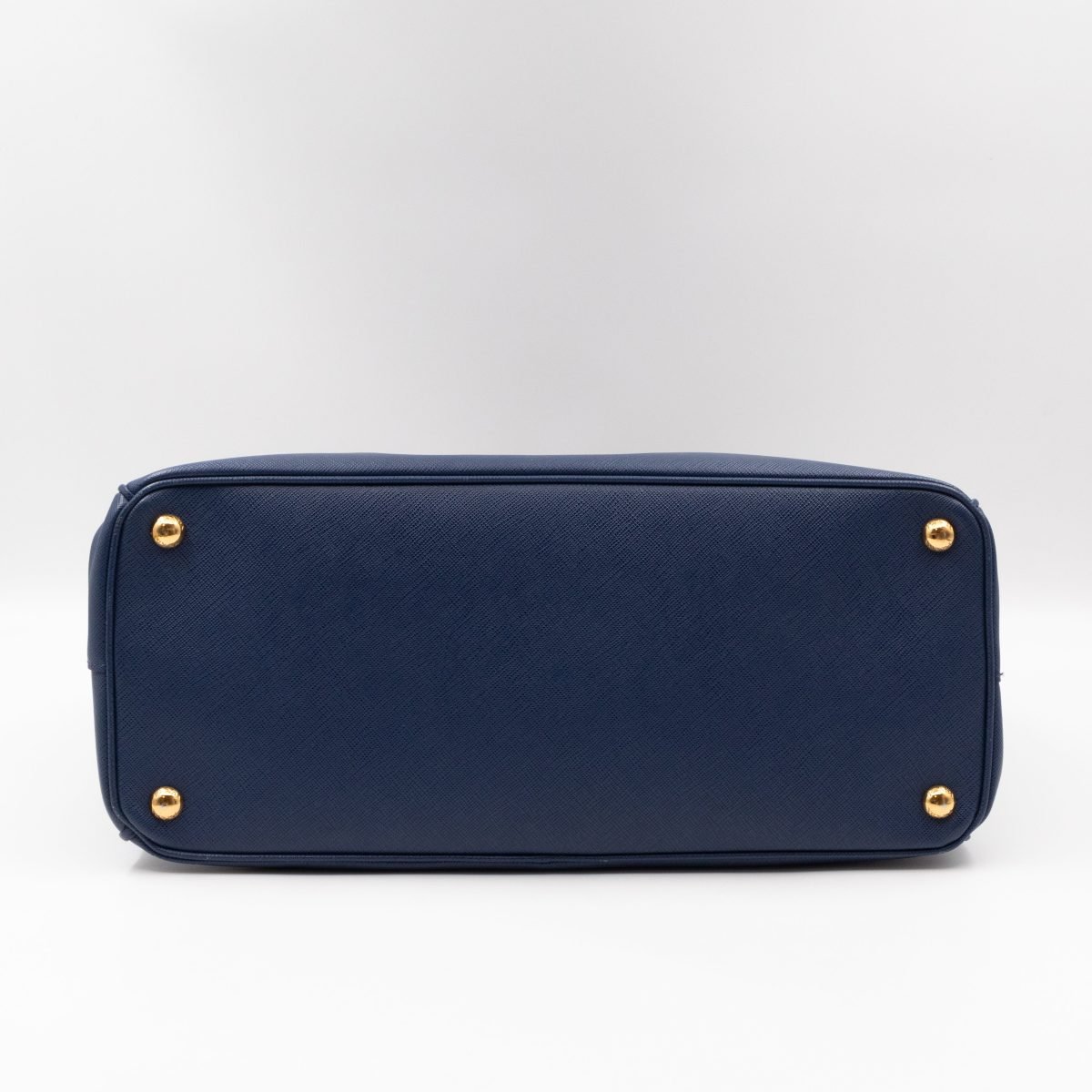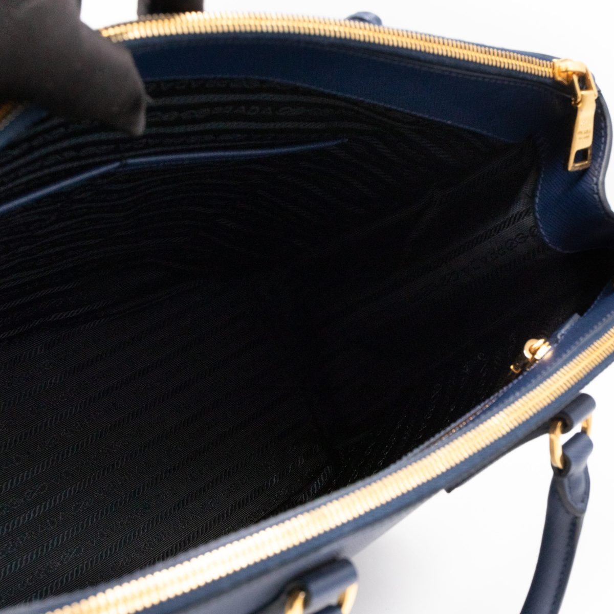 A Prada Galleria Large Double Zip bag in durable Saffiano leather. Very convenient double zipper bag in a blue color, combined with gold-tone hardware. This larger size fits your ipad, wallet, documents and even a small laptop. Great choice for daily and work use. Each side has zipper pockets, the middle compartment expands to a spacious size. Has no shoulder strap.