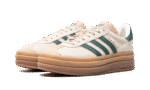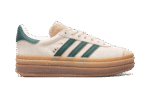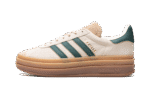 The Women’s adidas Gazelle Bold “Cream White/Collegiate Green” is a women’s-exclusive colorway of the retro sneaker with a stacked midsole and other modifications. The adidas Gazelle Bold updates the original Gazelle silhouette with a triple-stacked gum rubber midsole, giving the sneaker a decidedly contemporary look. The upper is complete with a cream suede construction with a tonal suede overlay on the toe. Collegiate Green leather Three Stripes and gold “Gazelle” branding appear on the side. More green leather accenting can be found on the heel tab while classic “adidas Gazelle” detailing is located on the hairy suede tongue.