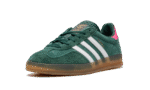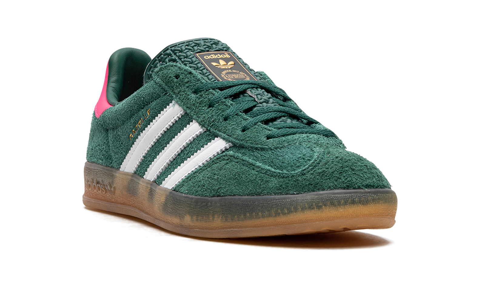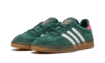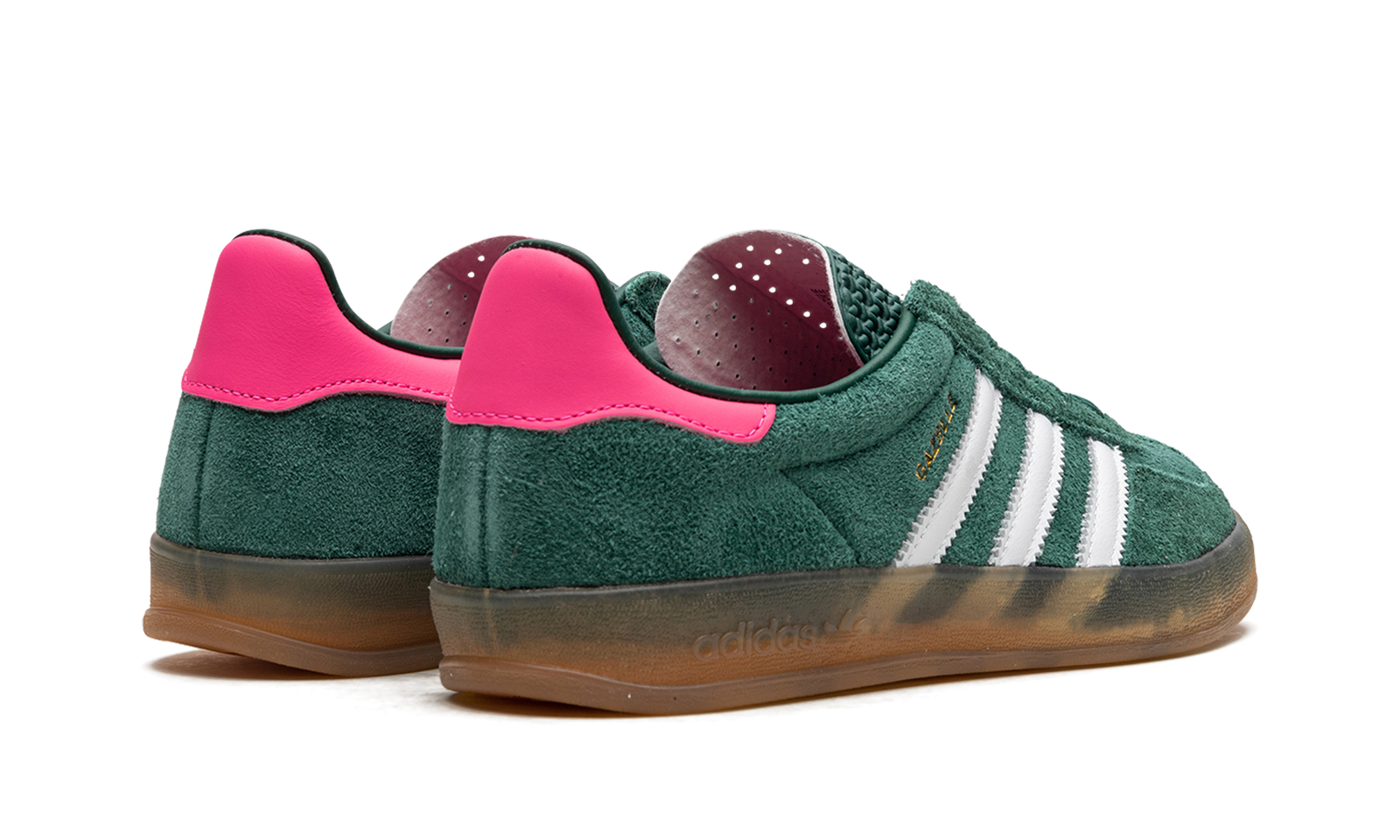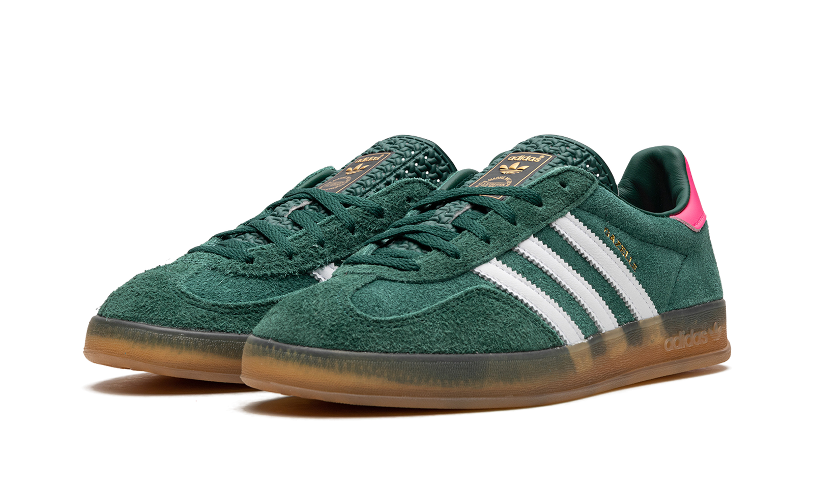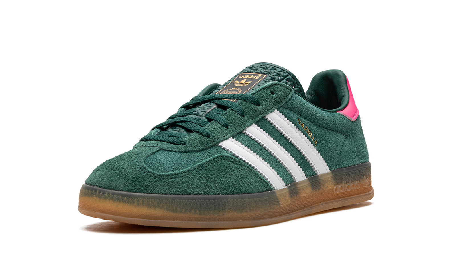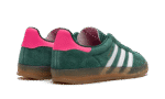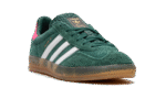 The Women’s adidas Gazelle Indoor “Collegiate Green/Lucid Pink” is a women’s-exclusive colorway of the retro indoor soccer shoe that turns heads with a green-and-pink design. An eye-grabbing colorway, the Gazelle Indoor in “Collegiate Green/Lucid Pink” features a green suede upper contrasted with white leather Three Stripes detailing on both sides. A gold “Gazelle” logo can be found on the lateral side of the shoe. Lucid Pink leather appears on the heel tab. A classic “adidas” logo is seen on the tongue. Underfoot, a semi-translucent gum rubber sole completes the look.