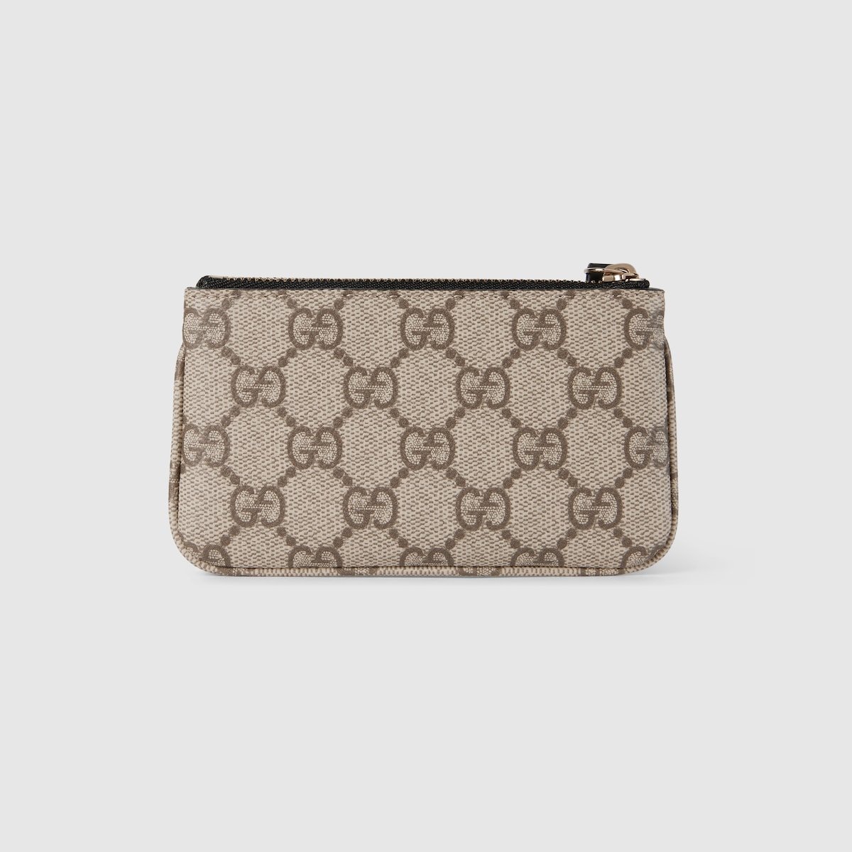 The GG Emblem collection reinterprets signature motifs through creativity and innovative functions , and is envisioned to be cherished for years to come. Introduced in the latest line of small accessories, this beige and dark brown key case is crafted from the new GG Monogram fabric. Featuring a zip closure with a contrasting black leather puller, the inside features a keychain hook.