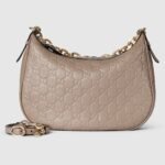 The new GG Emblem collection reinterprets the House??s history of elegance and craftsmanship. This medium shoulder bag is crafted from GG grainy leather and comes with a chain strap.