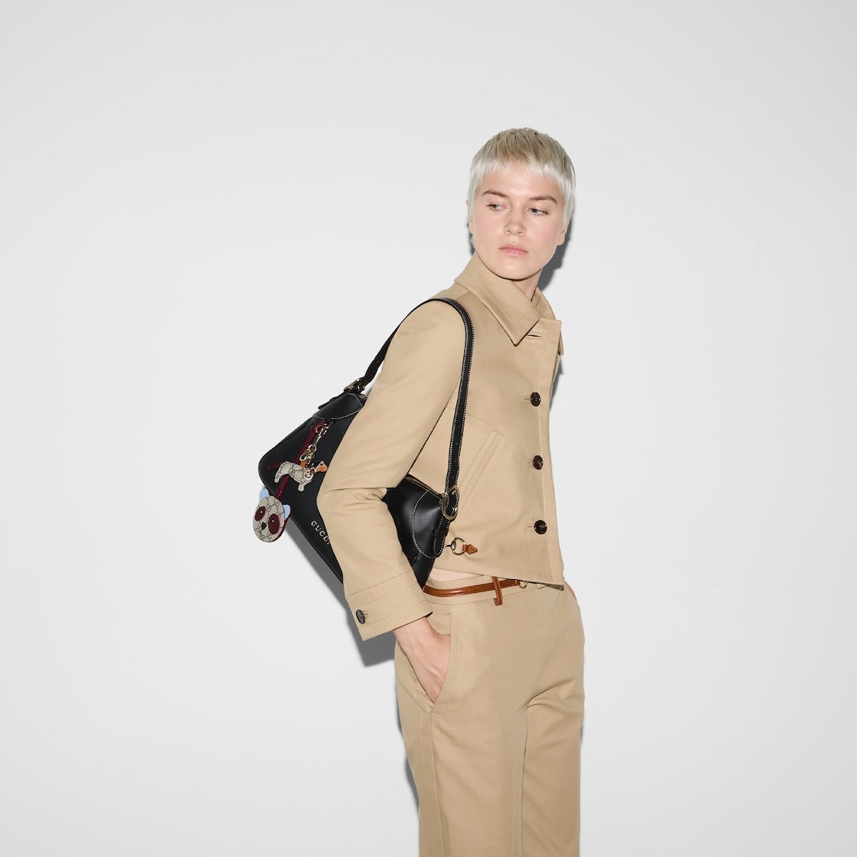 The new GG Emblem collection reinterprets the House??s history of elegance and craftsmanship. This medium shoulder bag features an additional D-ring for detachable items.