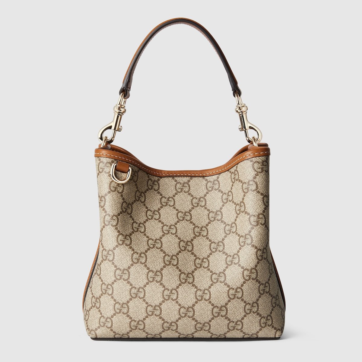 The new GG Emblem collection reinterprets the House??s history of elegance and craftsmanship. This mini bucket bag highlights functional design with an interior compartment, in Web cotton lining.