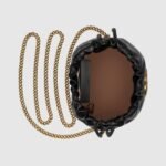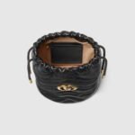 The world of GG Marmont expands with the introduction of a mini bucket bag shape in black matelass?? leather with a chevron motif. Inspired by an archival design from the ’70s??a hallmark era of the House??the Double G decorates the front of this accessory. Featuring a chain strap and drawstring closure the versatile shape can also be worn as a cross body bag.