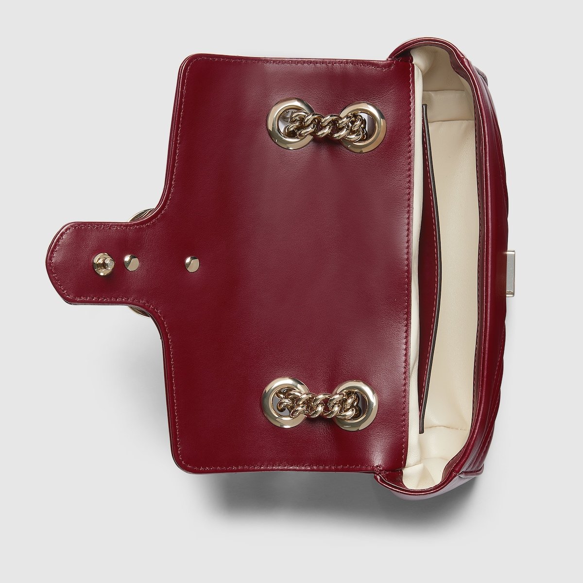 Presenting the House’s red hue Gucci Rosso Ancora on the GG Marmont, this mini shoulder bag presents the style in a signature color for Pre-Fall, complete with light gold toned hardware and ivory leather lining.