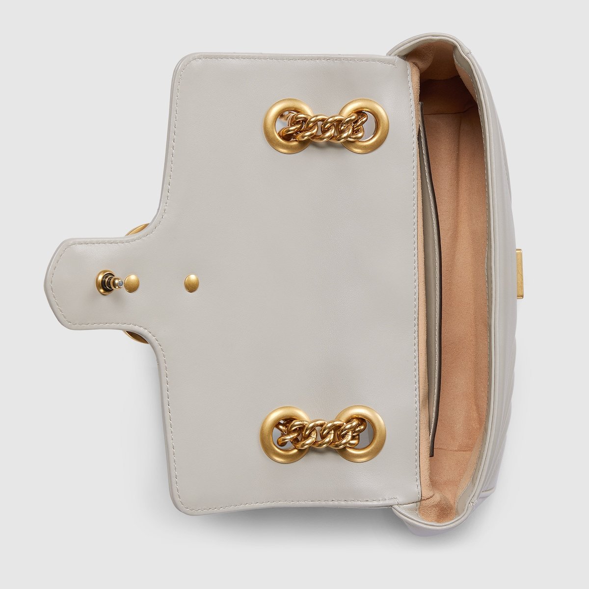 Made in matelass?? chevron leather in a neutral shade of light grey, the now recognizable GG Marmont mini bag has a softly structured shape and a flap closure with Double G hardware. Designed to be worn multiple ways, the chain strap slides to change between a shoulder and a top handle bag.