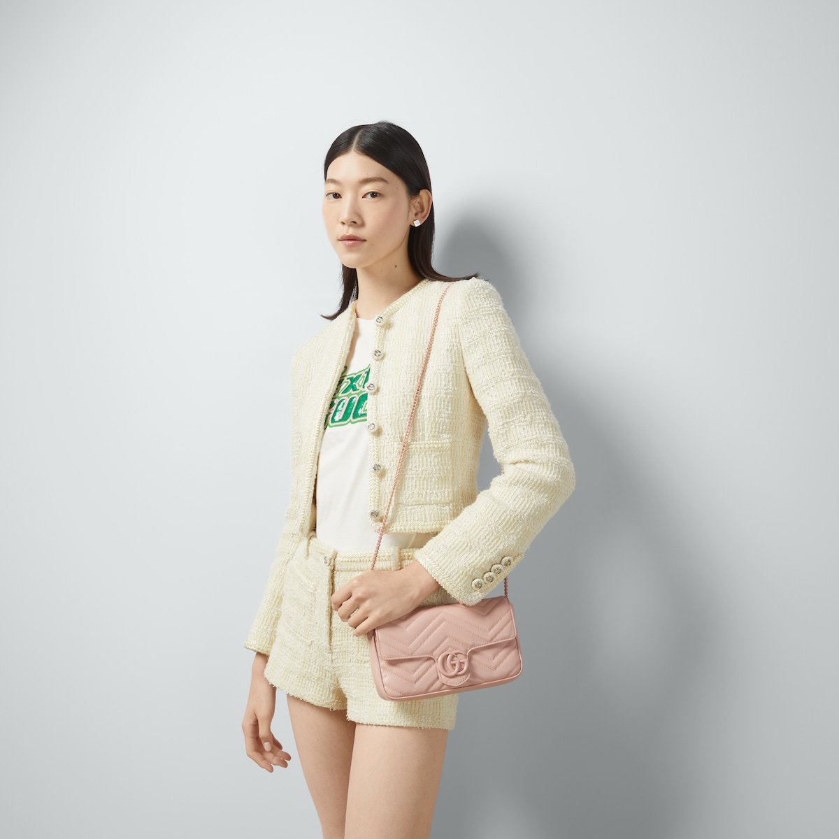 Gucci’s signature small accessories are constantly evolving around a dynamic narrative. A delicate shade of pink defines this GG Marmont mini bag, completed by matching tonal hardware. The inside features a contrasting white leather card case that can be detached.