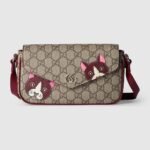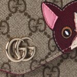 Sweet and playful animals, such as the cat, dog and panda, appear on a selection of small accessories in new GG Monogram coated fabric. The fun motifs are applied using a screen printing technique and leather patchwork. This mini shoulder bag comes to life with two cats on the front in multicolored leather patches.
