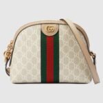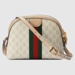 A heritage material from the archive, GG Supreme has been reimagined in Gucci Love Parade in different colour combinations and combined with contemporary as well as classic styles. The Ophidia shoulder bag is presented in a beige and white variation of the signature material with a tonal trim. Originally a play on a ’30s design, the canvas speaks to the historical narrative that runs throughout the collection.