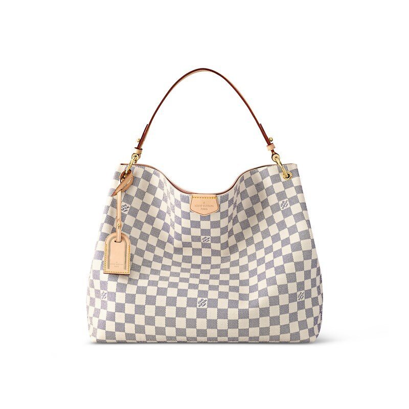 The Graceful MM hobo in fresh Damier Azur canvas is an extra-roomy yet lightweight bag to carry every day. Natural leather detailing and shiny gold-tone hardware add a refined, signature touch. The body-friendly design combines with a supple, flat handle for stylish and comfortable over-the-shoulder wear. The magnetic closure and zipped inside pocket keep belongings secure.